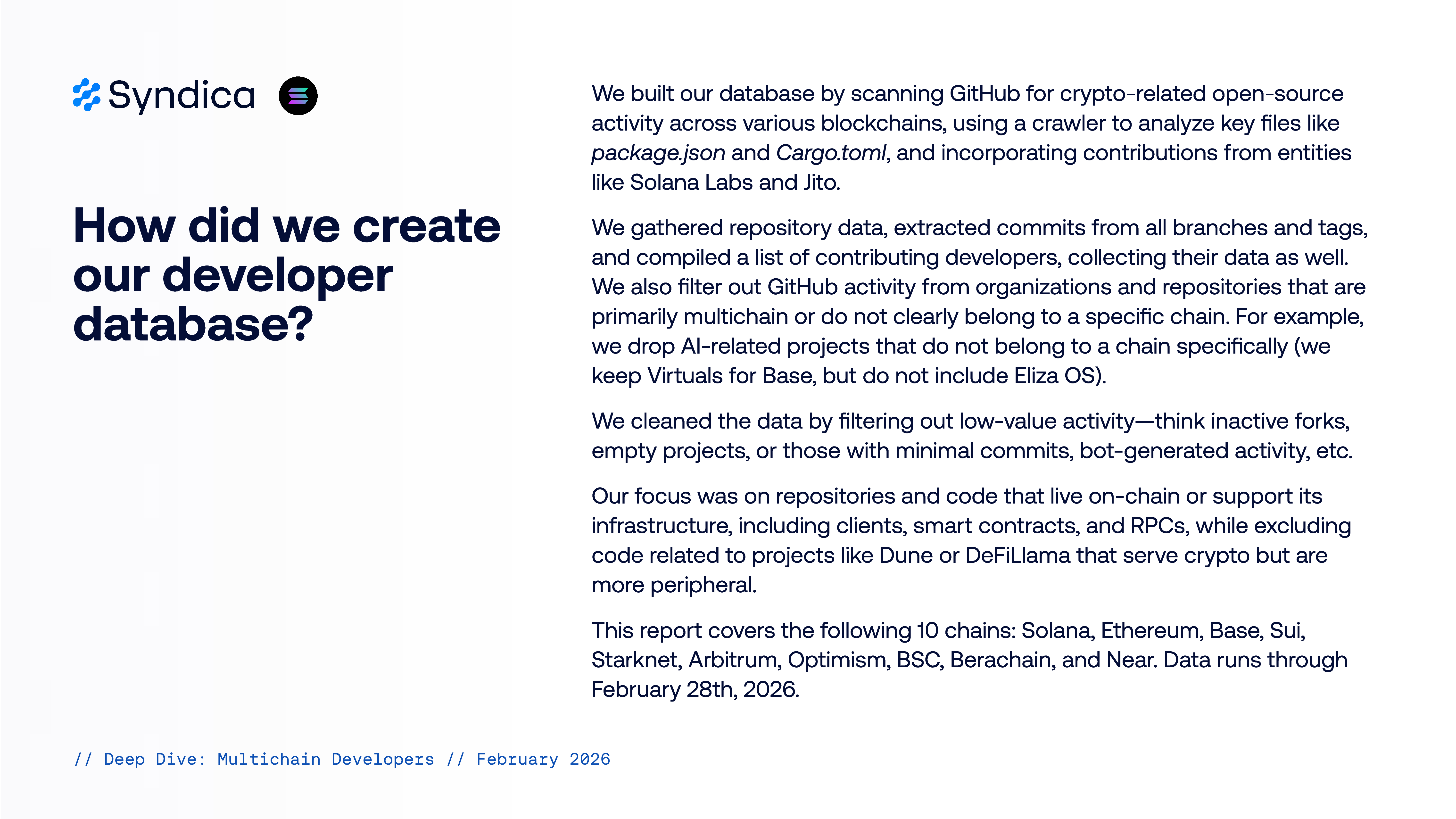 We gathered repository data, extracted commits from all branches and tags, and compiled a list of contributing developers, collecting their data as well. We also filter out GitHub activity from organizations and repositories that are primarily multichain or do not clearly belong to a specific chain. For example, we drop AI-related projects that do not belong to a chain specifically (we keep Virtuals for Base, but do not include Eliza OS).