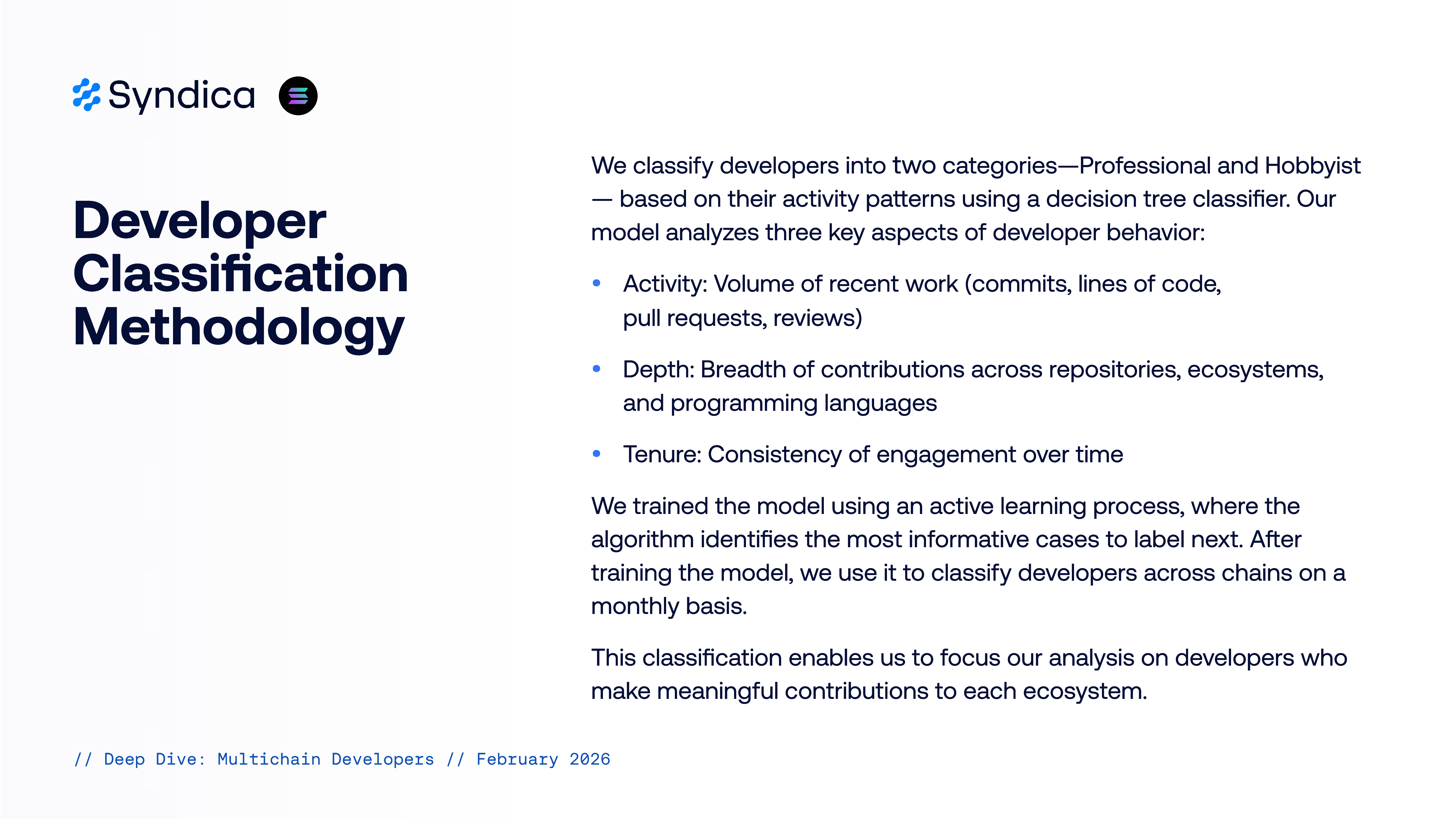 We trained the model using an active learning process, where the algorithm identifies the most informative cases to label next. After training the model, we use it to classify developers across chains on a monthly basis.