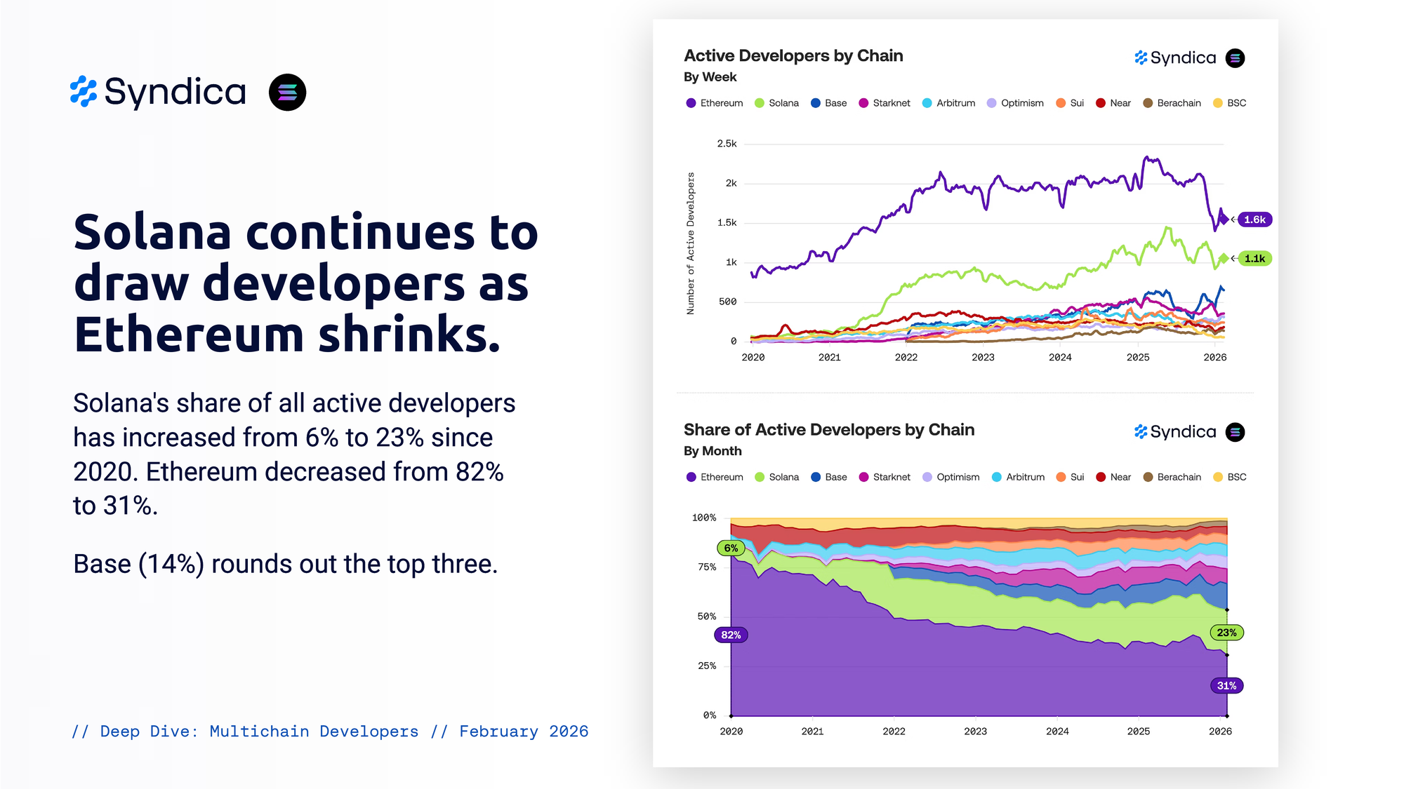Solana's share of all active developers has increased from 6% to 23% since 2020. Ethereum decreased from 82% to 31%. Base (14%) rounds out the top three.