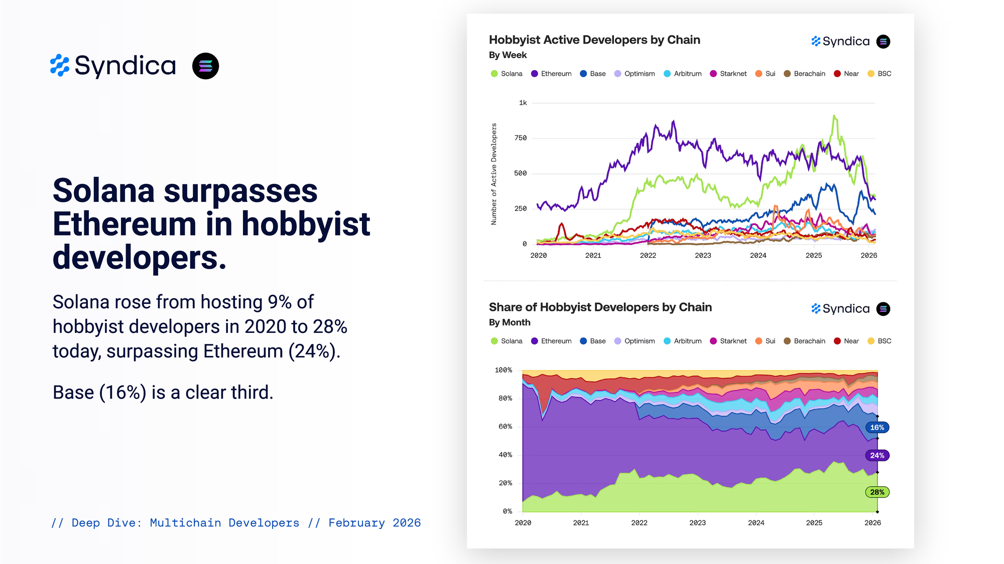 Solana rose from hosting 9% of hobbyist developers in 2020 to 28% in 2025, surpassing Ethereum (24%). Base (16%) is a clear third.
