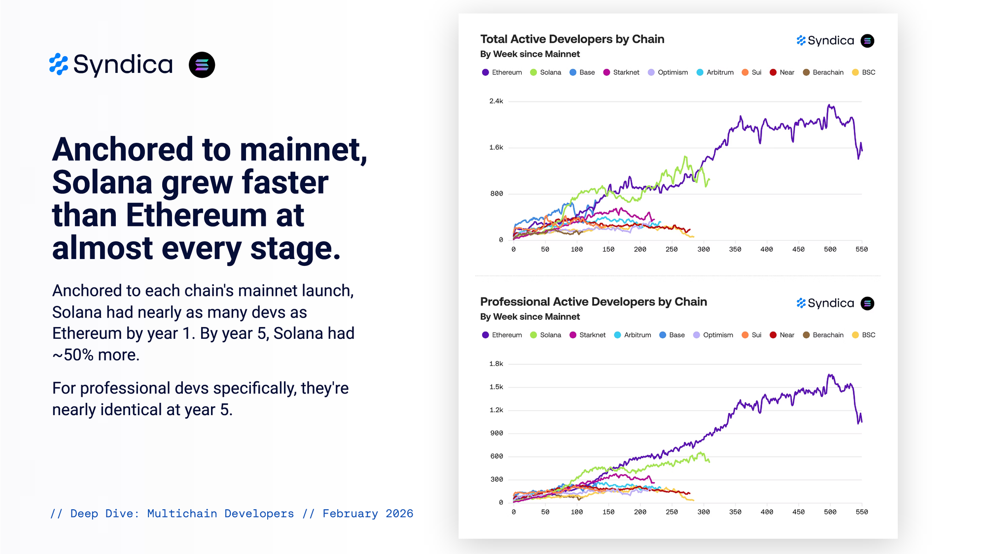 Anchored to each chain's mainnet launch, Solana had nearly as many devs as Ethereum by year 1. By year 5, Solana had ~50% more. For professional devs specifically, they're nearly identical at year 5.