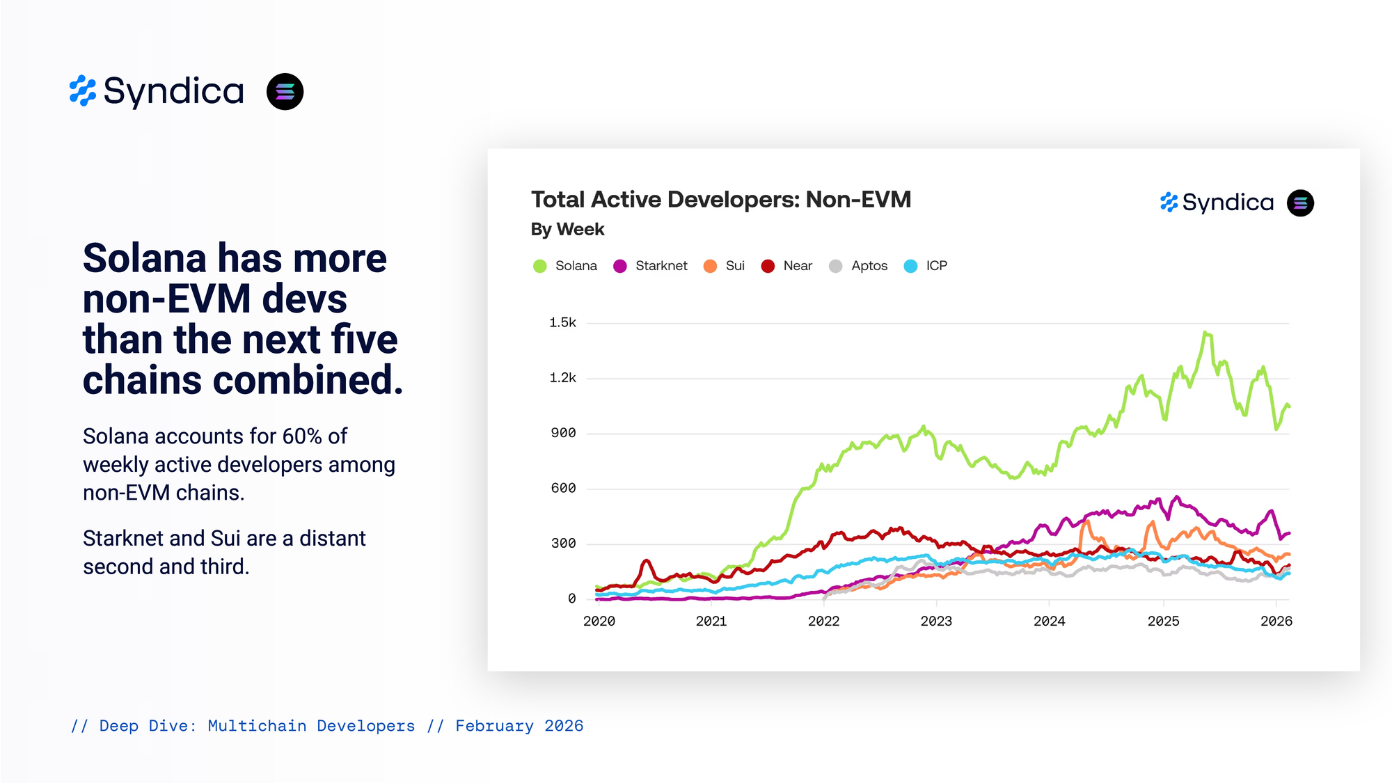 Solana accounts for 60% of weekly active developers among non-EVM chains. Starknet and Sui are a distant second and third.