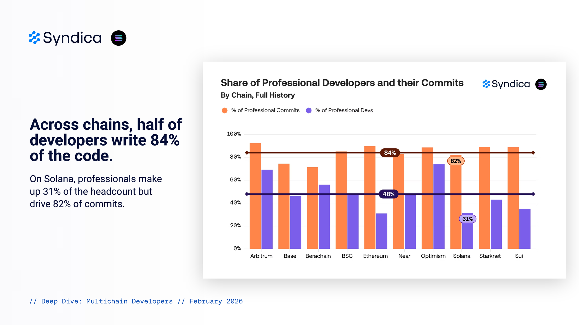 On Solana, professionals make up 31% of the headcount but drive 82% of commits.