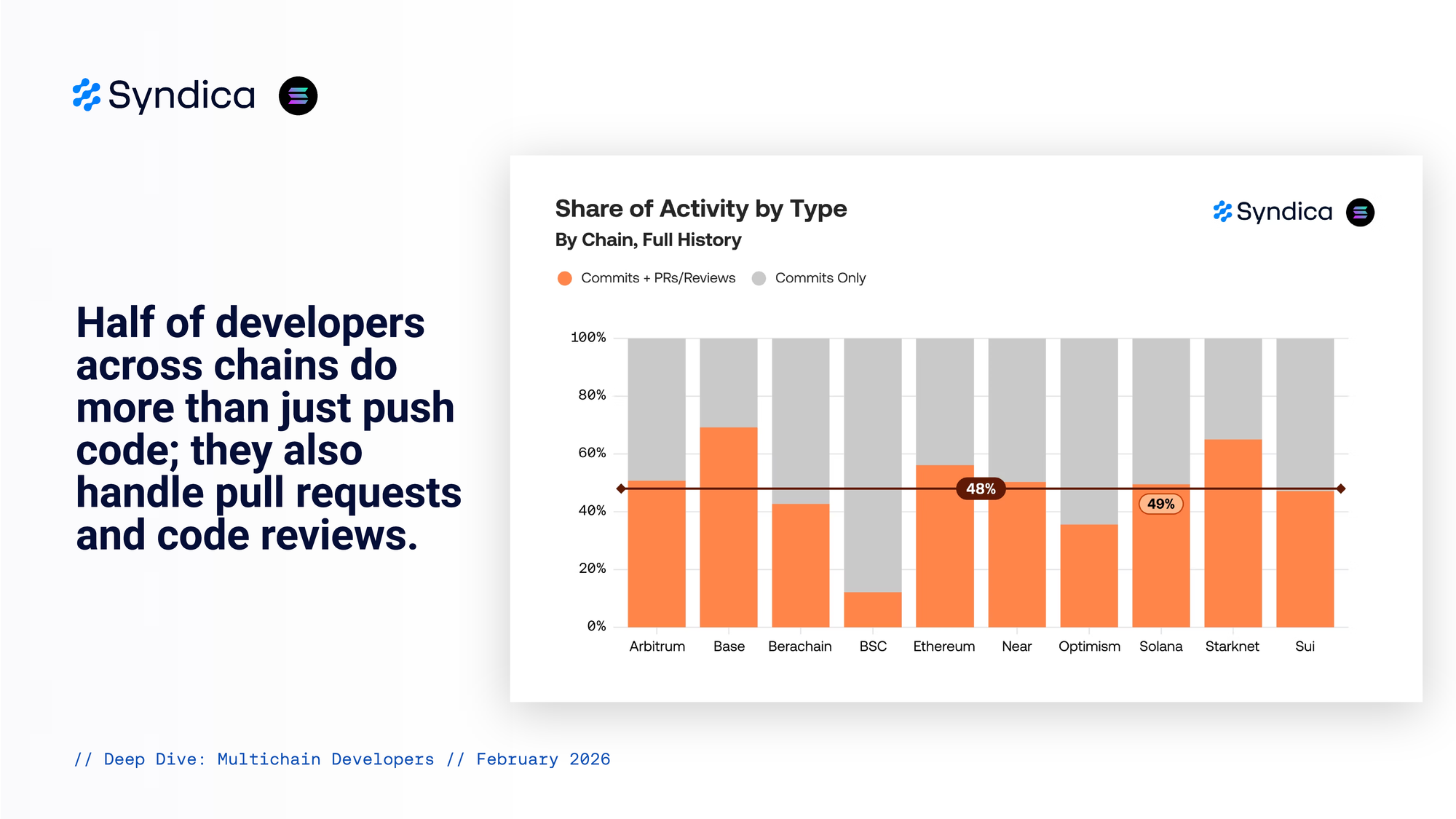 Half of developers across chains do more than just push code; they also handle pull requests and code reviews.