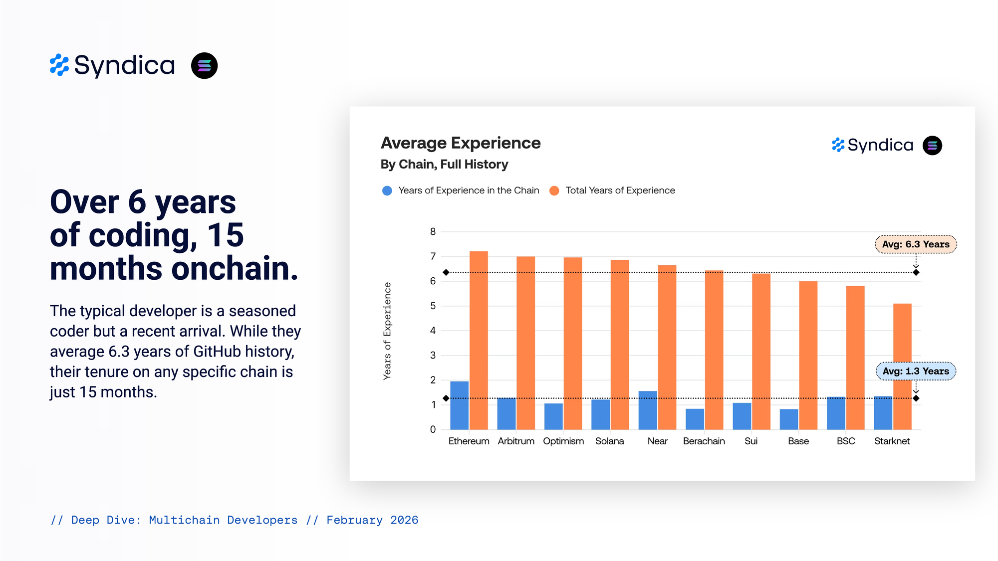 The typical developer is a seasoned coder but a recent arrival. While they average 6.3 years of GitHub history, their tenure on any specific chain is just 15 months.