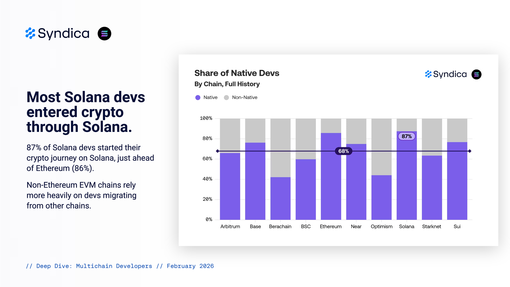 87% of Solana devs started their crypto journey on Solana, just ahead of Ethereum (86%). Non-Ethereum EVM chains rely more heavily on devs migrating from other chains.
