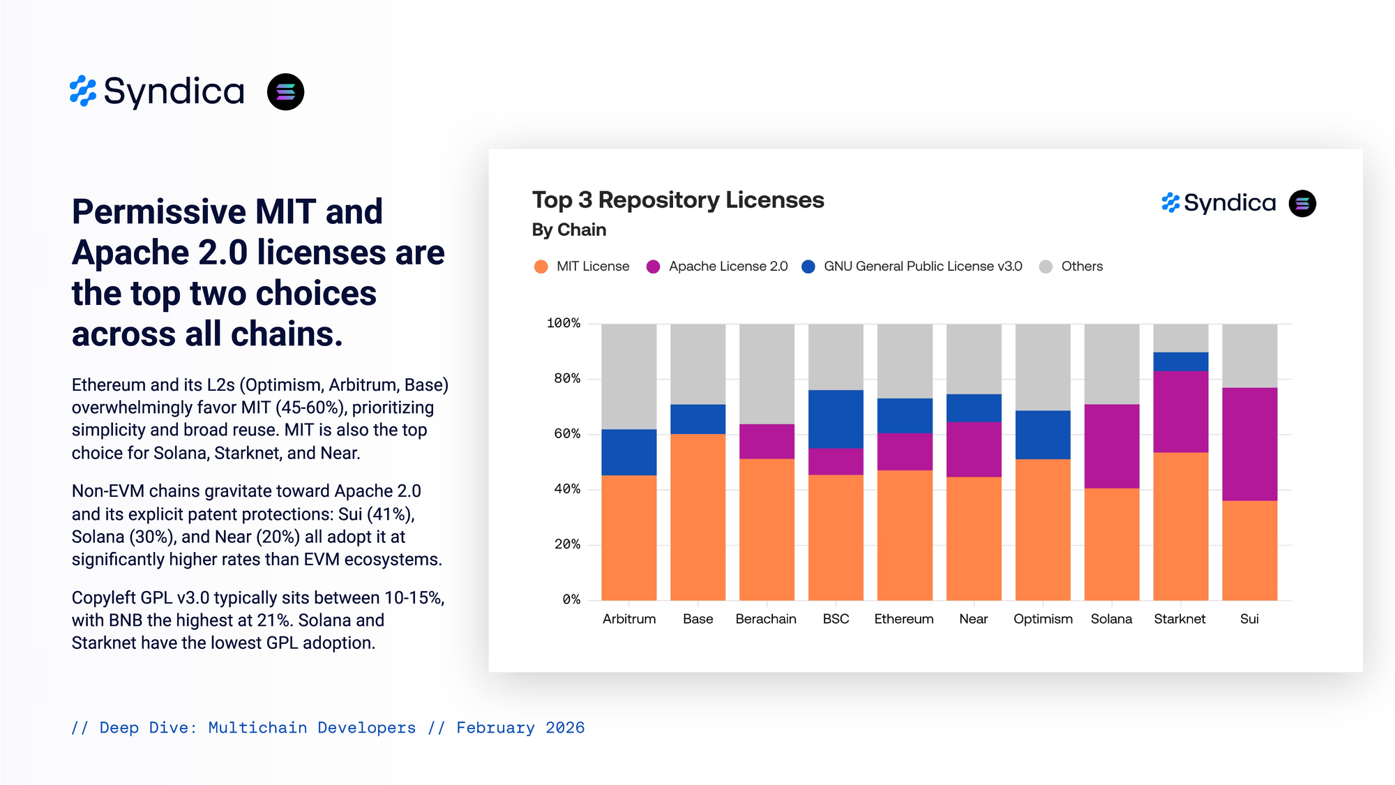 Permissive MIT and Apache 2.0 licenses are the top two choices across all chains.