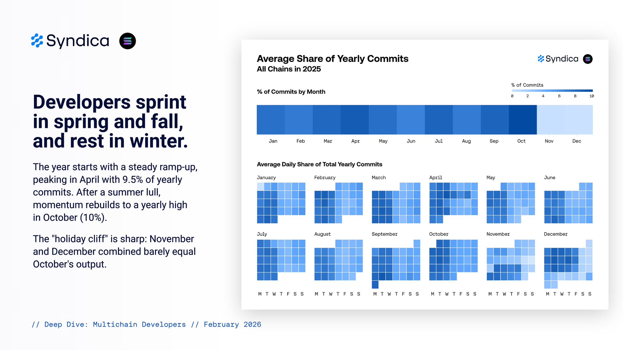 The year starts with a steady ramp-up, peaking in April with 9.5% of yearly commits. After a summer lull, momentum rebuilds to a yearly high in October (10%). The "holiday cliff" is sharp: November and December combined barely equal October's output.