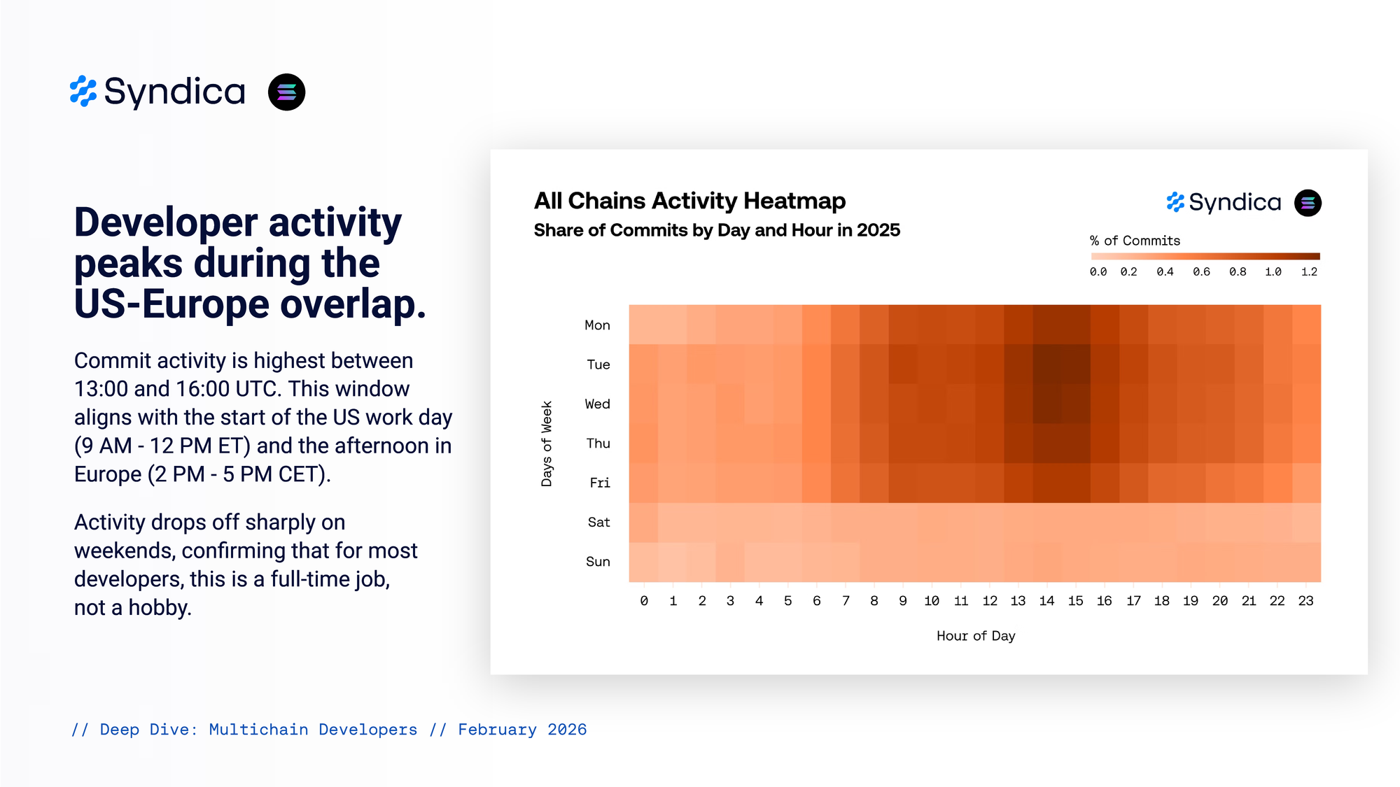 Commit activity is highest between 13:00 and 16:00 UTC. This window aligns with the start of the US work day (9 AM - 12 PM ET) and the afternoon in Europe (2 PM - 5 PM CET). Activity drops off sharply on weekends, confirming that for most developers, this is a full-time job, not a hobby.