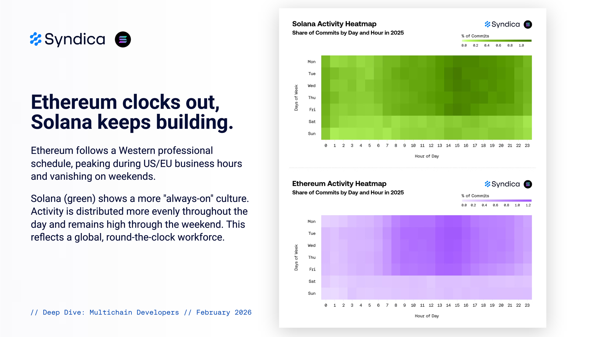 Ethereum follows a Western professional schedule, peaking during US/EU business hours and vanishing on weekends. Solana (green) shows a more "always-on" culture. Activity is distributed more evenly throughout the day and remains high through the weekend. This reflects a global, round-the-clock workforce.