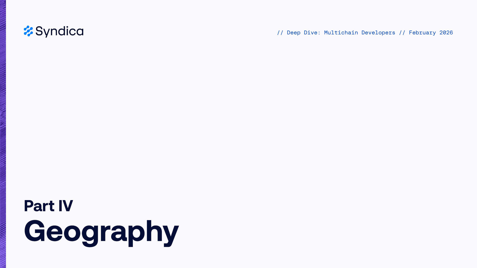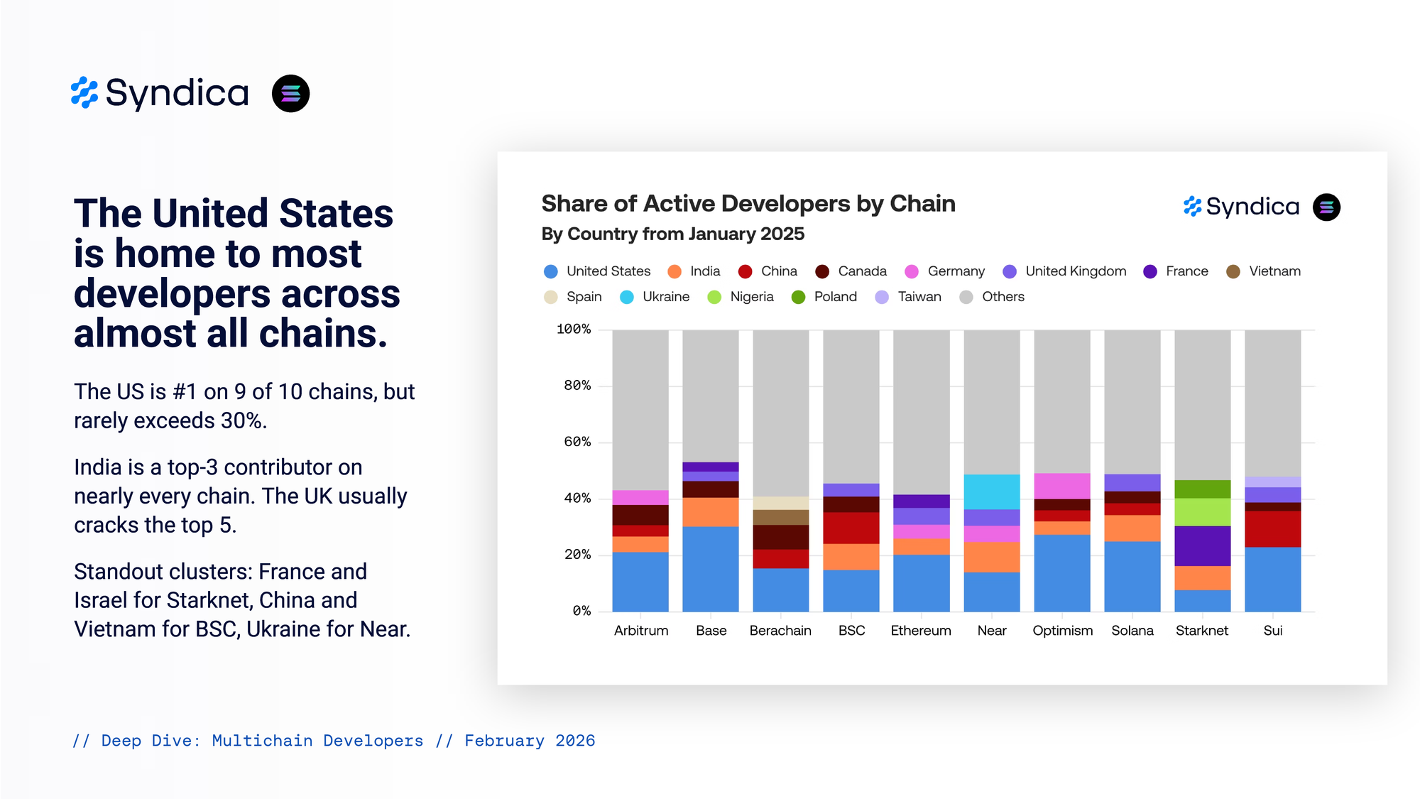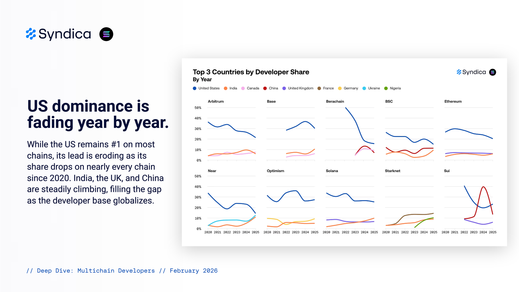 While the US remains #1 on most chains, its lead is eroding as its share drops on nearly every chain since 2020. India, the UK, and China are steadily climbing, filling the gap as the developer base globalizes.
