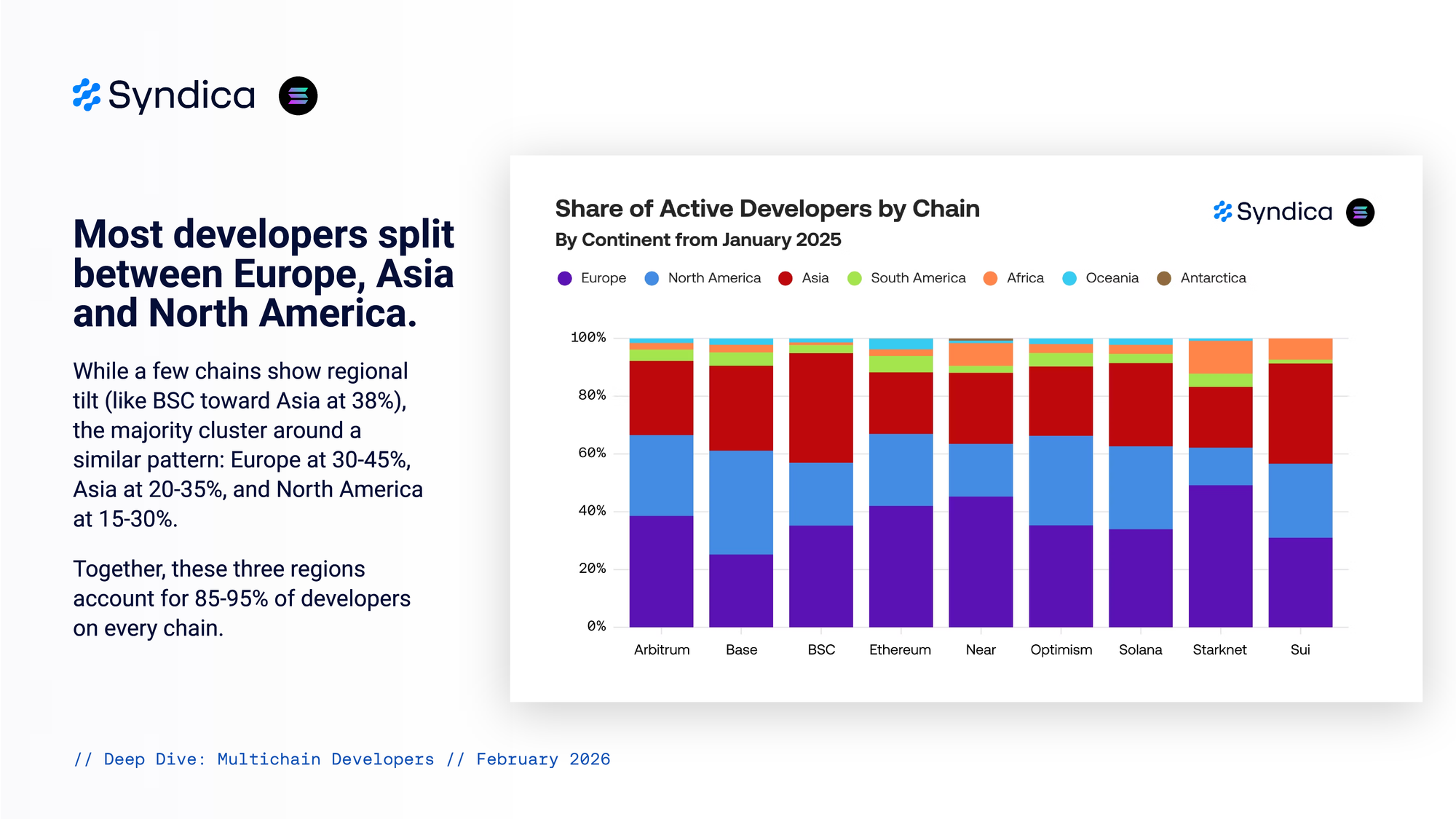 While a few chains show regional tilt (like BSC toward Asia at 38%), the majority cluster around a similar pattern: Europe at 30-45%, Asia at 20-35%, and North America at 15-30%. Together, these three regions account for 85-95% of developers on every chain.