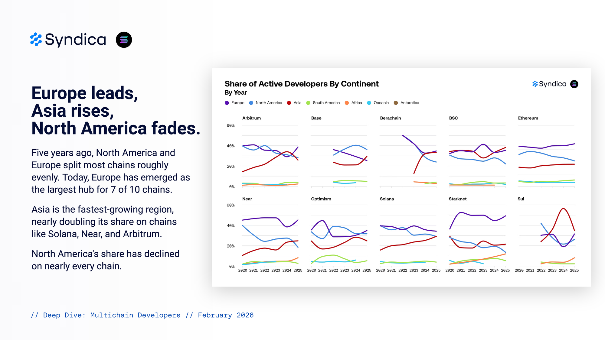 Five years ago, North America and Europe split most chains roughly evenly. Today, Europe has emerged as the largest hub for 7 of 10 chains. Asia is the fastest-growing region, nearly doubling its share on chains like Solana, Near, and Arbitrum. North America's share has declined on nearly every chain.