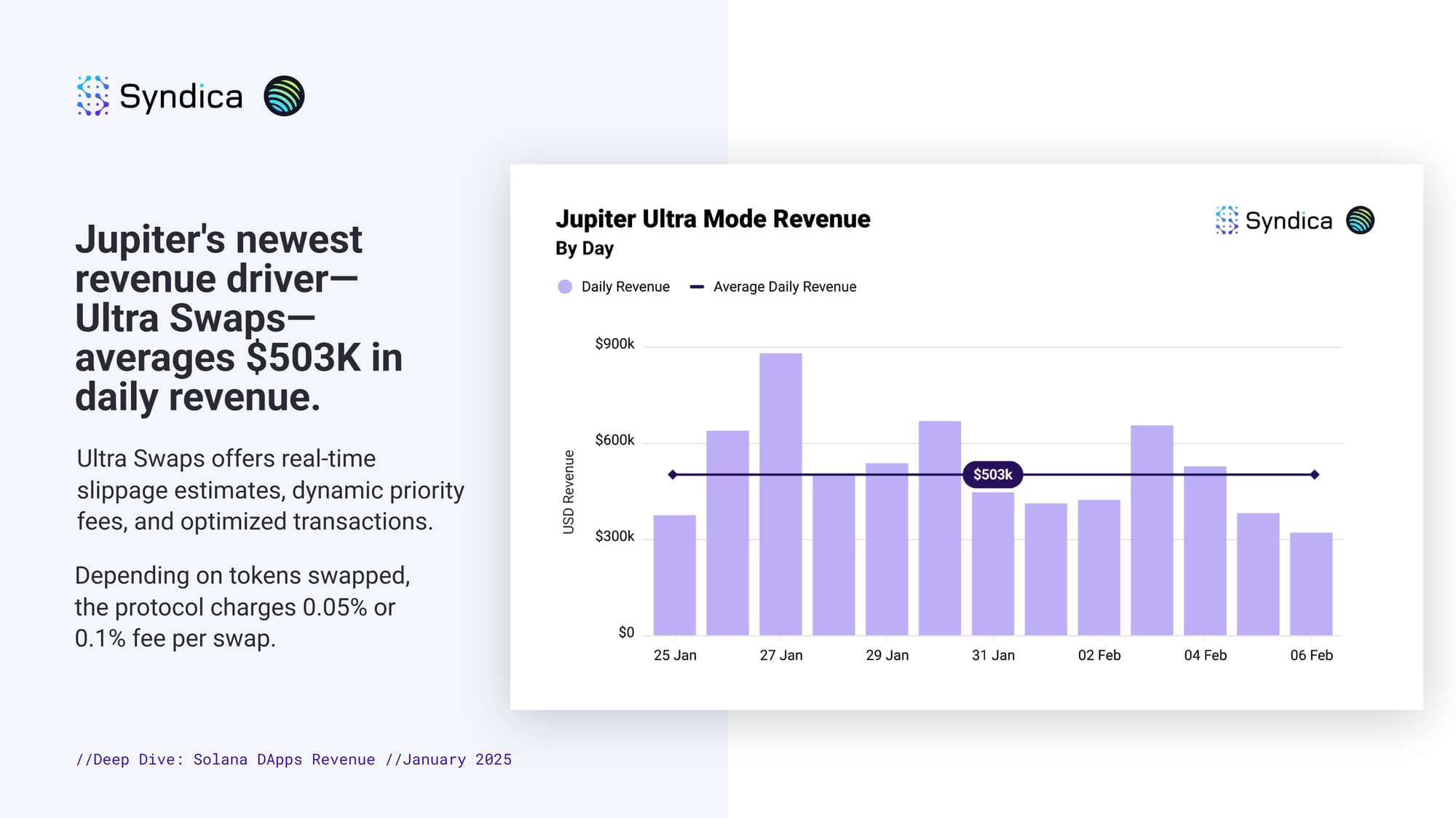 Jupiter's newest revenue driver—Ultra Swaps— averages $503K in daily revenue. Ultra Swaps offers real-time slippage estimates, dynamic priority fees, and optimized transactions. Depending on tokens swapped, the protocol charges 0.05% or 0.1% fee per swap.