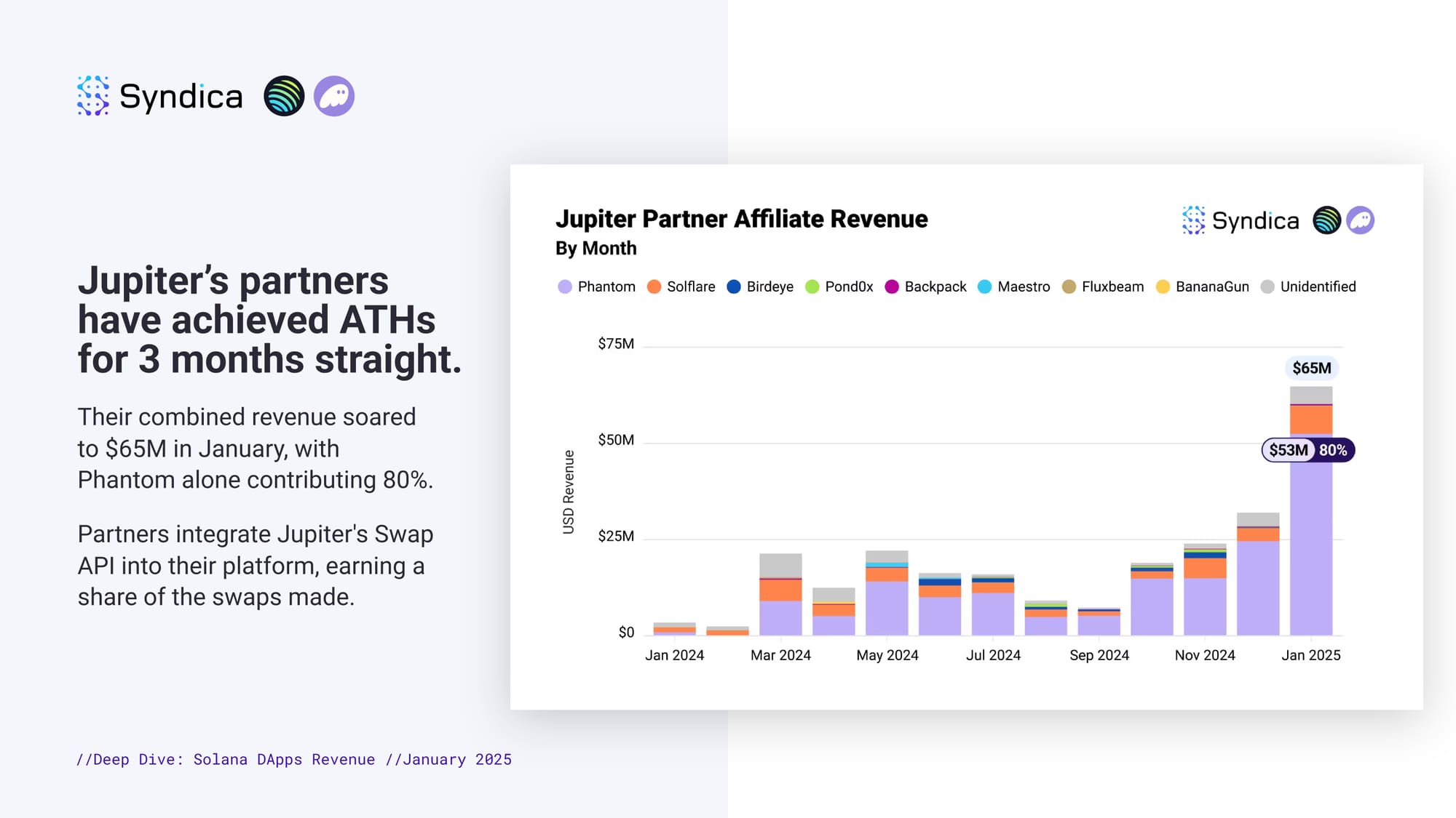 Jupiter’s partners have achieved ATHs for 3 months straight. Their combined revenue soared to $65M in January, with Phantom alone contributing 80%. Partners integrate Jupiter's Swap API into their platform, earning a share of the swaps made.