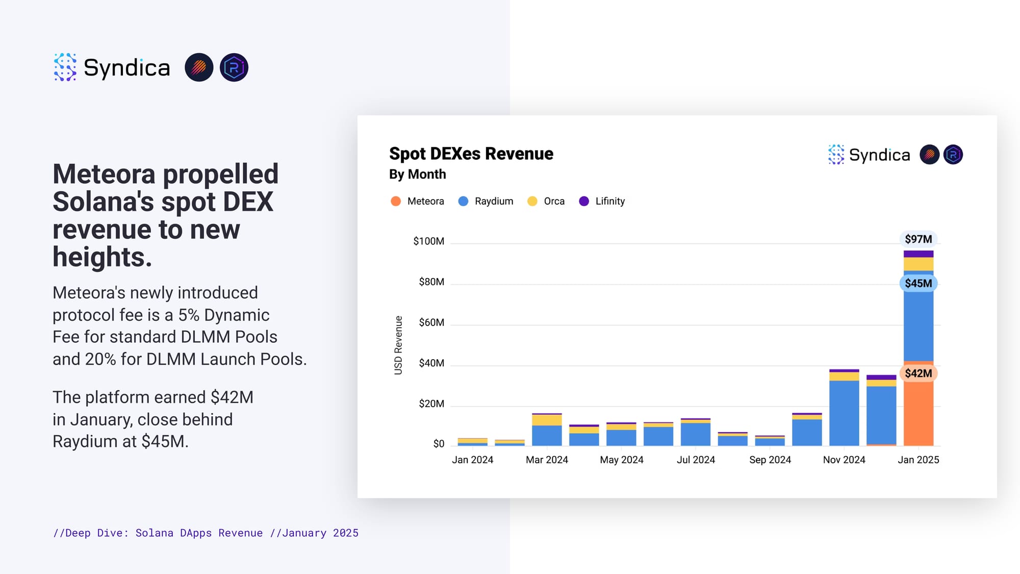 Meteora propelled Solana's spot DEX revenue to new heights. Meteora's newly introduced protocol fee is a 5% Dynamic Fee for standard DLMM Pools and 20% for DLMM Launch Pools. The platform earned $42M in January, close behind Raydium at $45M.