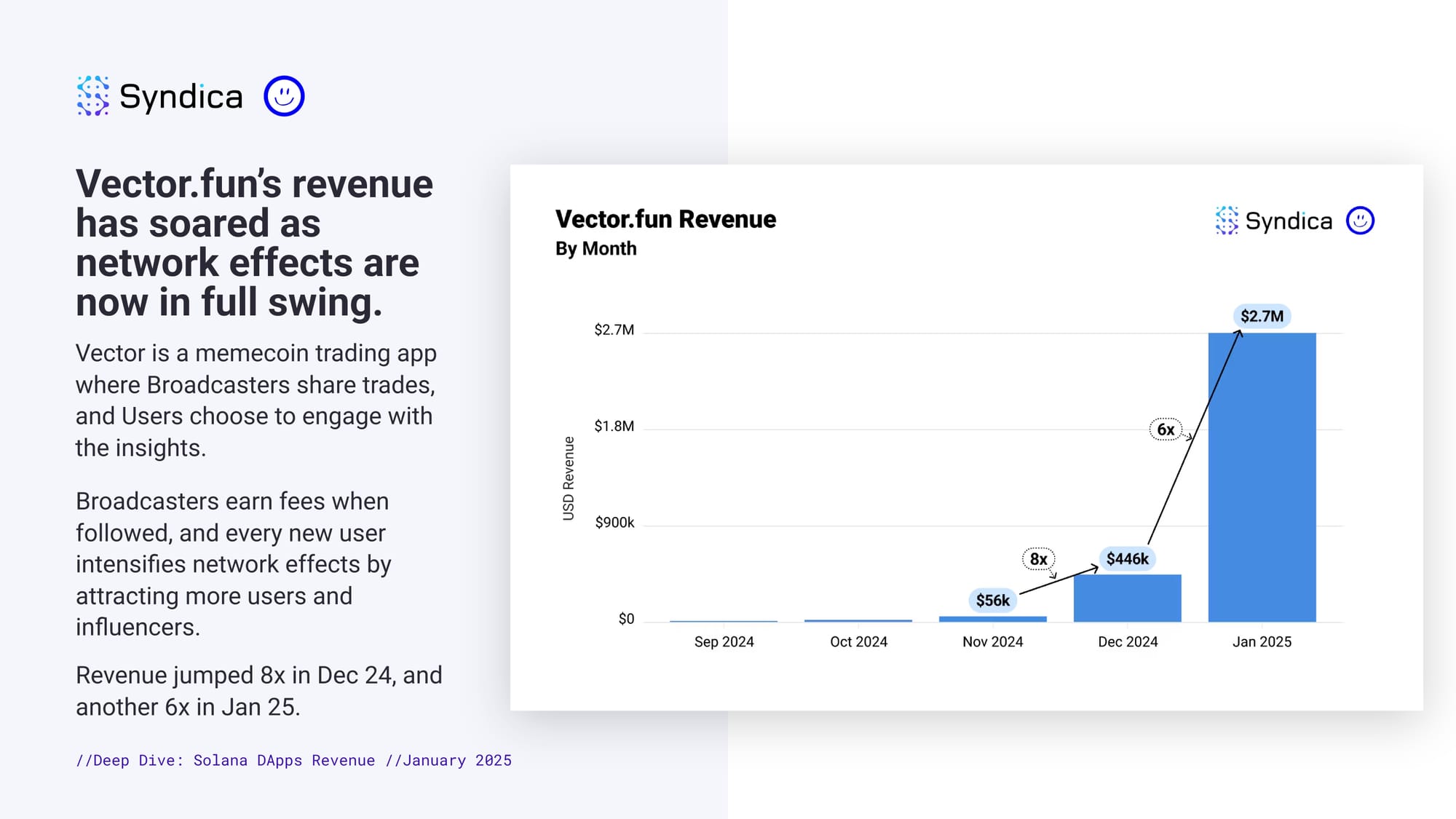 Vector.fun’s revenue has soared as network effects are now in full swing. Vector is a memecoin trading app where Broadcasters share trades, and Users choose to engage with the insights. Broadcasters earn fees when followed, and every new user intensifies network effects by attracting more users and influencers. Revenue jumped 8x in Dec 24, and another 6x in Jan 25.
