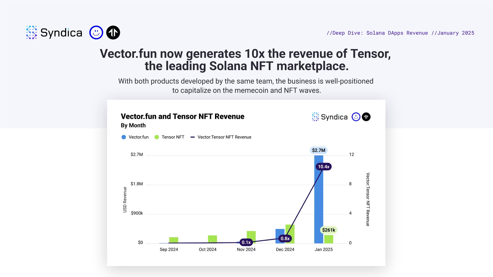 Vector.fun now generates 10x the revenue of Tensor, the leading Solana NFT marketplace. With both products developed by the same team, the business is well-positioned to capitalize on the memecoin and NFT waves.