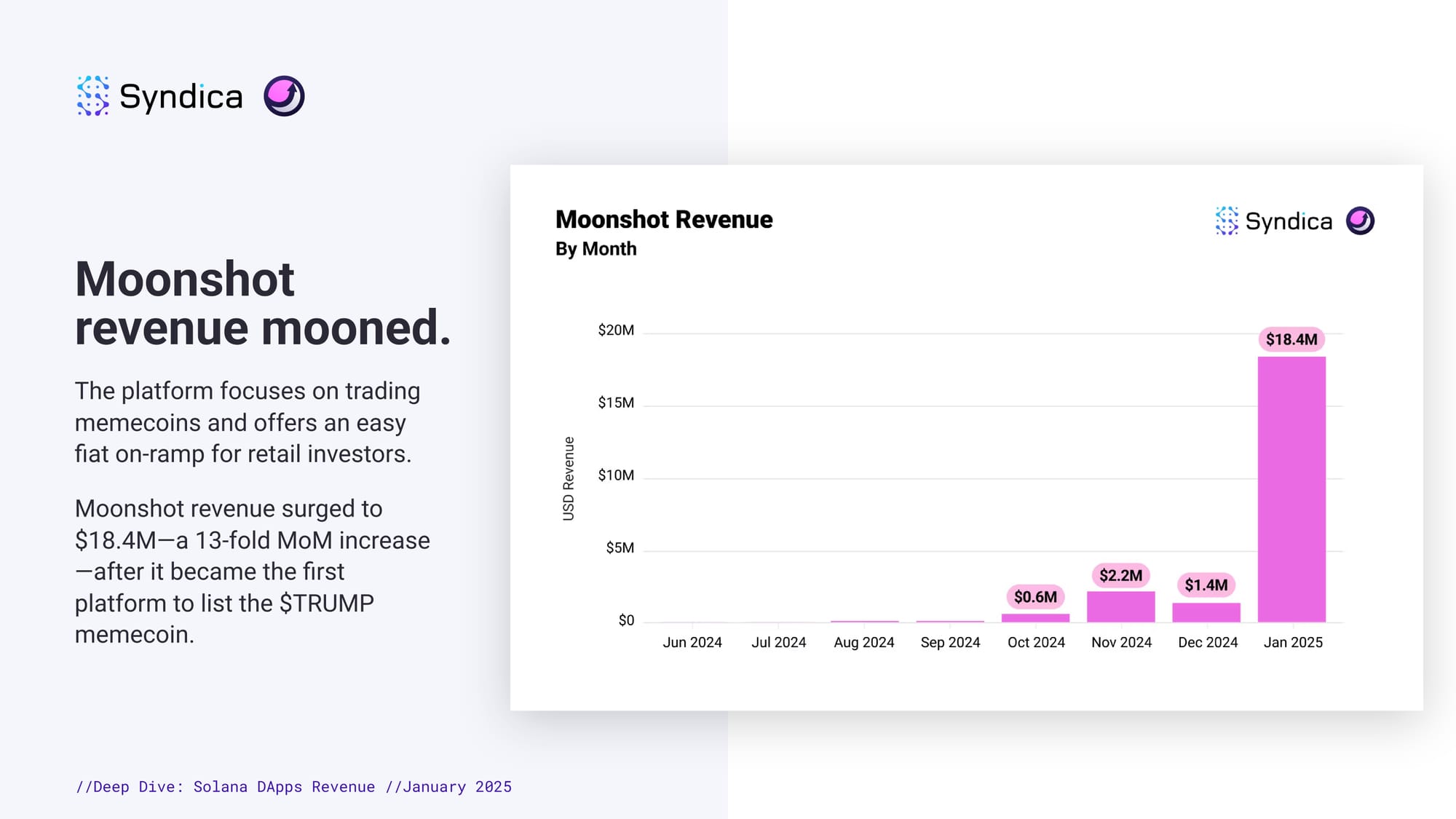 Moonshot revenue mooned. The platform focuses on trading memecoins and offers an easy fiat on-ramp for retail investors. Moonshot revenue surged to $18.4M—a 13-fold MoM increase—after it became the first platform to list the $TRUMP memecoin.