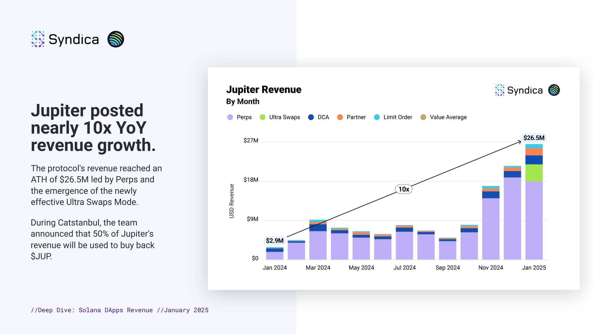 Jupiter posted nearly 10x YoY revenue growth. The protocol's revenue reached an ATH of $26.5M led by Perps and the emergence of the newly effective Ultra Swaps Mode. During Catstanbul, the team announced that 50% of Jupiter's revenue will be used to buy back $JUP.