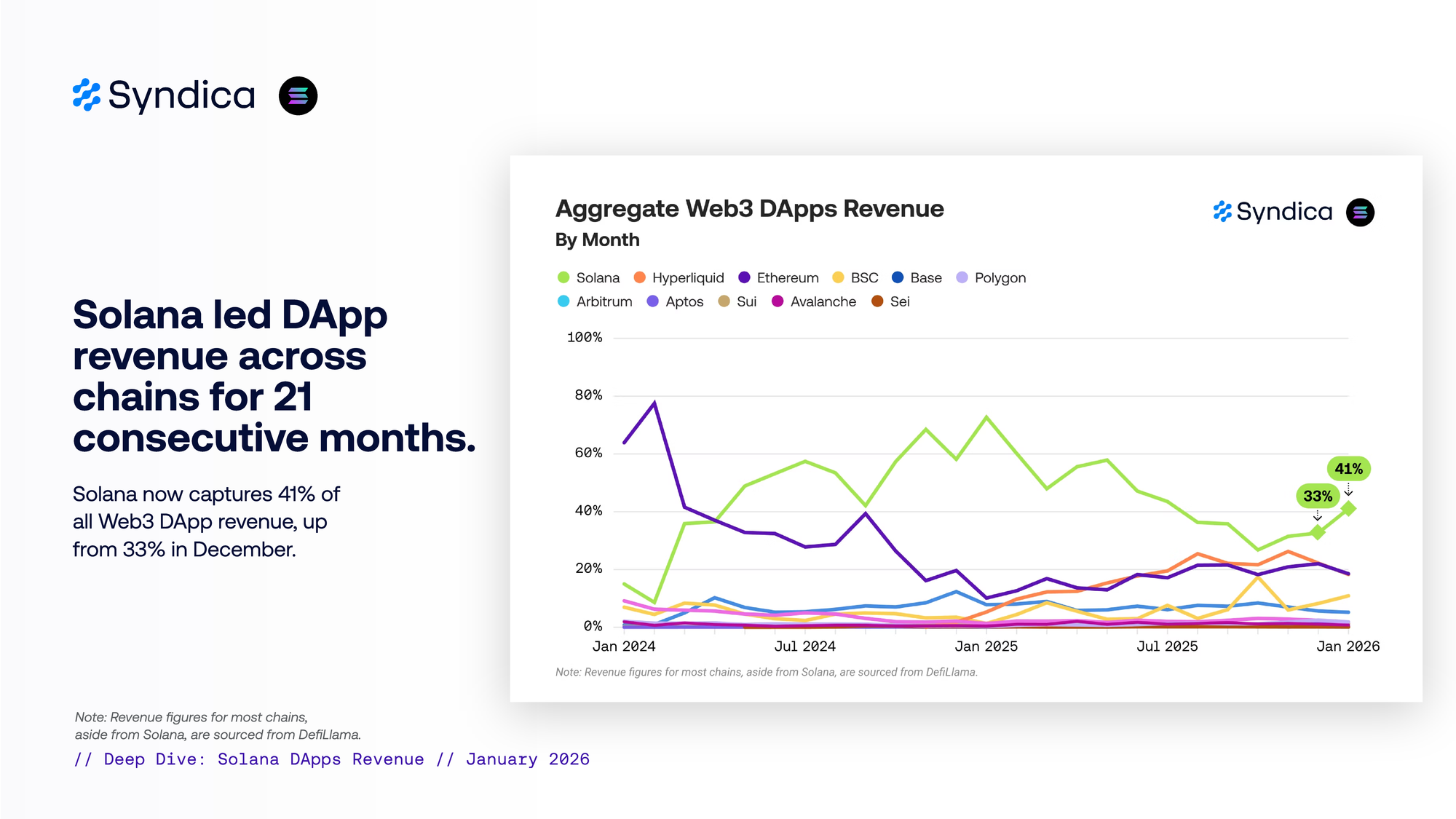Solana now captures 41% of all Web3 DApp revenue, up from 33% in December. Solana led DApp revenue across chains for 21 consecutive months.