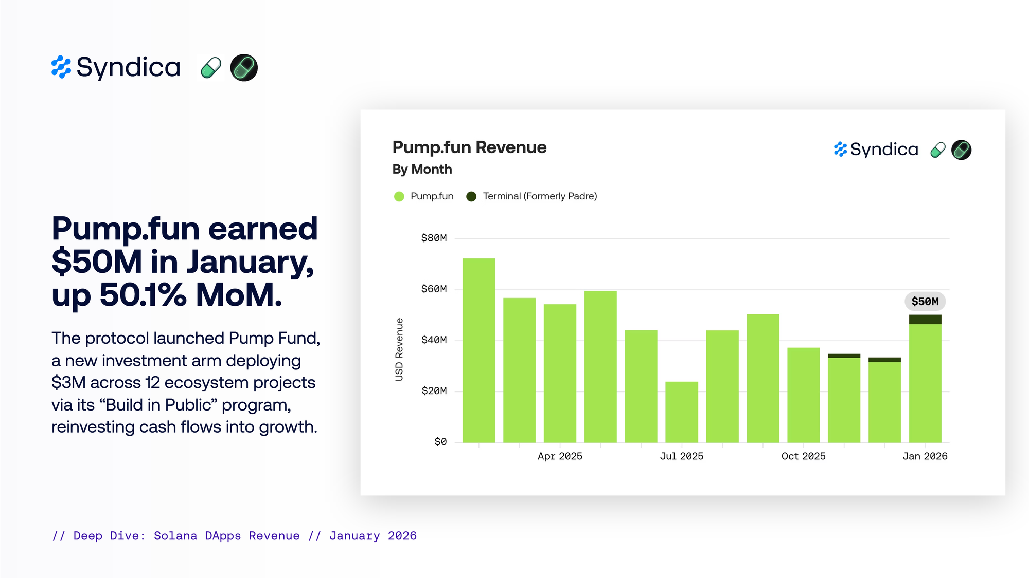 Pump.fun earned $50M in January, up 50.1% MoM. The protocol launched Pump Fund, a new investment arm deploying $3M across 12 ecosystem projects via its “Build in Public” program, reinvesting cash flows into growth.
