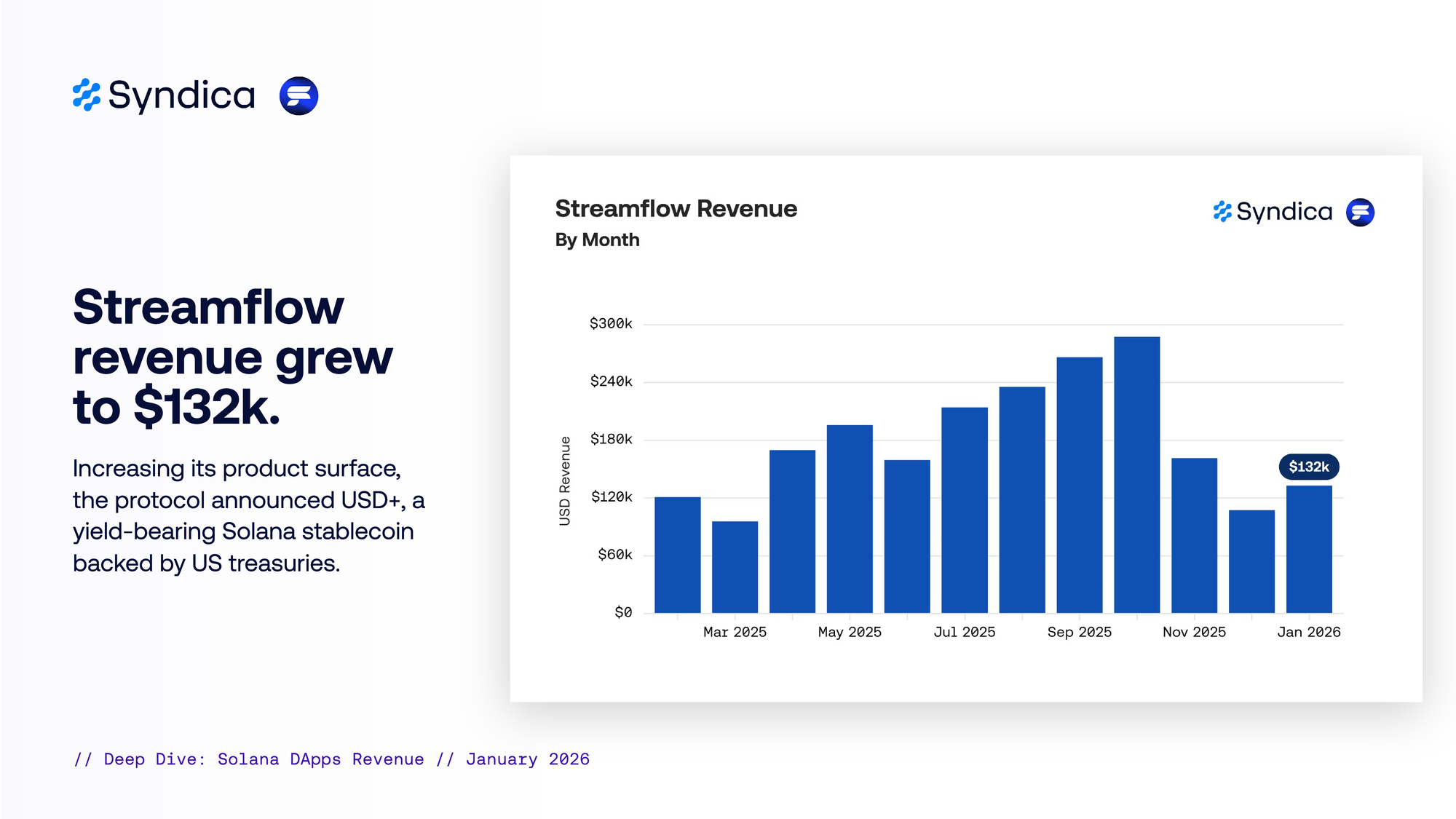Streamflow revenue grew to $132k. Increasing its product surface, the protocol announced USD+, a yield-bearing Solana stablecoin backed by US treasuries.