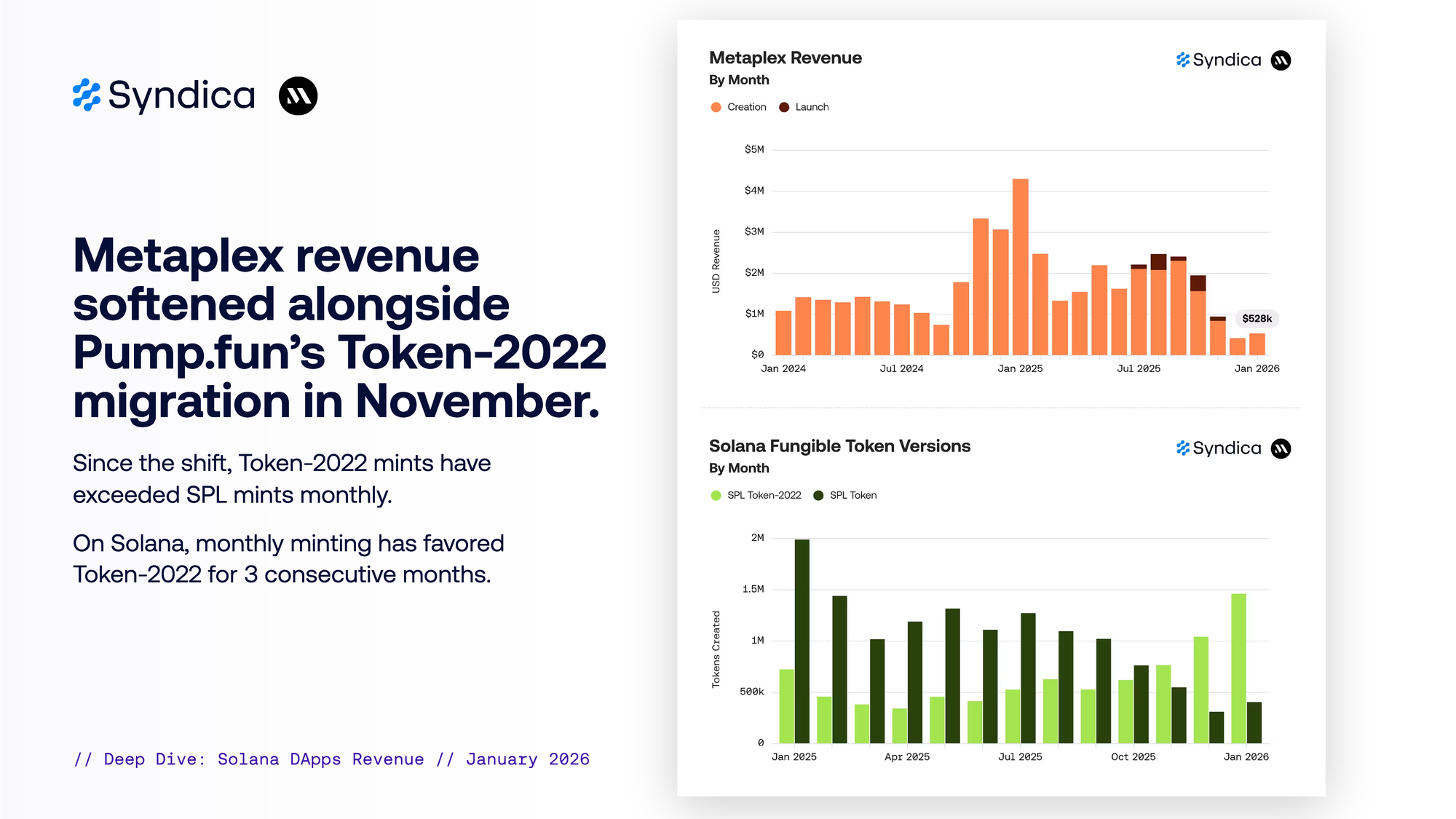 Metaplex revenue softened alongside Pump.fun’s Token-2022 migration in November. Since the shift, Token-2022 mints have exceeded SPL mints monthly. On Solana, monthly minting has favored Token-2022 for 3 consecutive months.