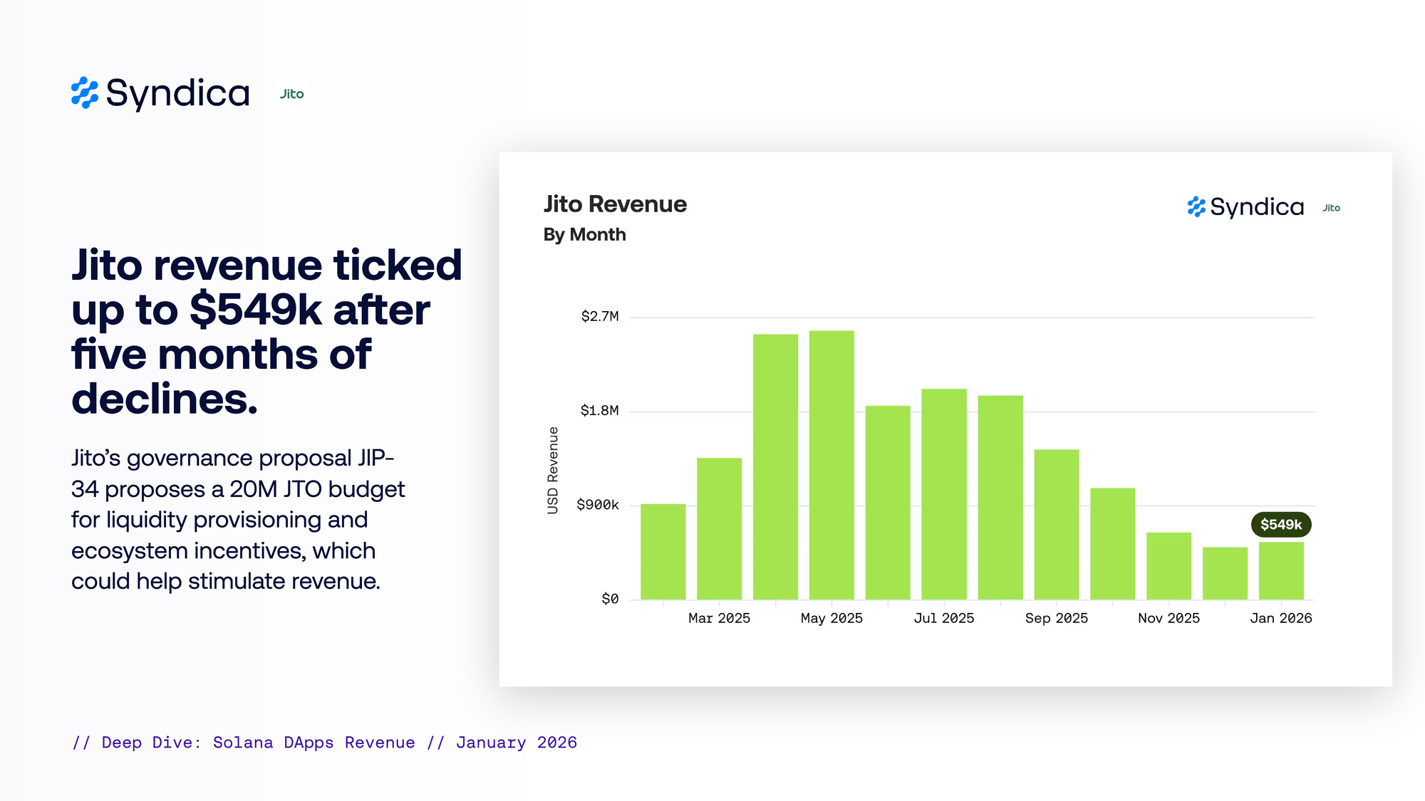 Jito revenue ticked up to $549k after five months of declines. Jito’s governance proposal JIP-34 proposes a 20M JTO budget for liquidity provisioning and ecosystem incentives, which could help stimulate revenue.
