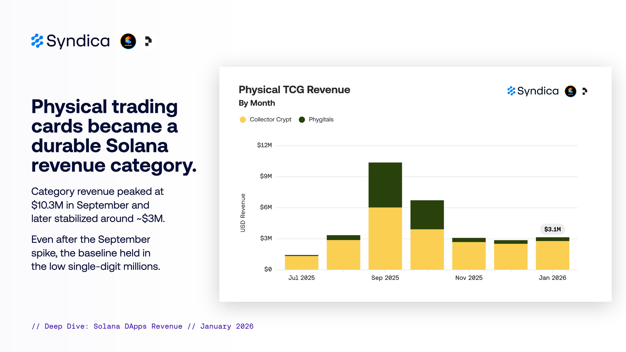 Physical trading cards became a durable Solana revenue category. Category revenue peaked at $10.3M in September and later stabilized around ~$3M. Even after the September spike, the baseline held in the low single-digit millions.