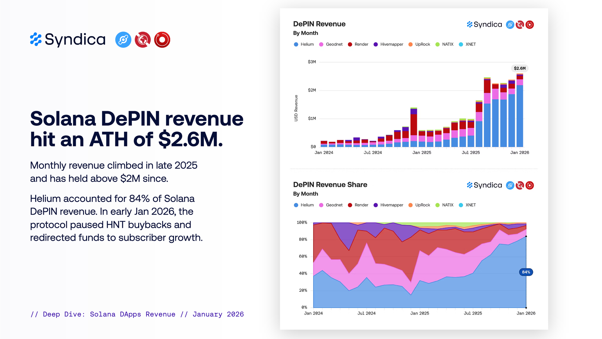 Solana DePIN revenue hit an ATH of $2.6M. Monthly revenue climbed in late 2025 and has held above $2M since. Helium accounted for 84% of Solana DePIN revenue. In early Jan 2026, the protocol paused HNT buybacks and redirected funds to subscriber growth.
