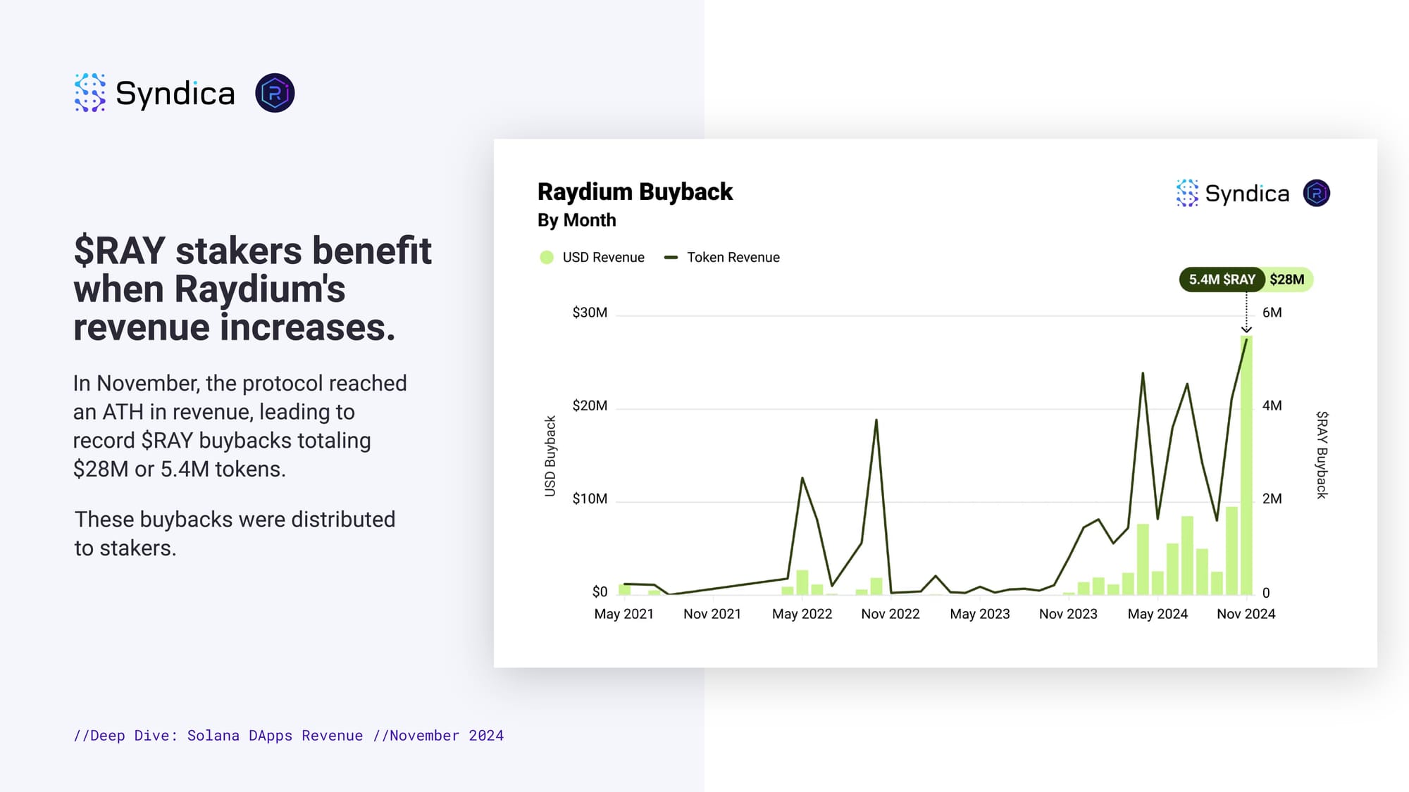 $RAY stakers benefit when Raydium's revenue increases. In November, the protocol reached an ATH in revenue, leading to record $RAY buybacks totaling $28M or 5.4M tokens. These buybacks were distributed to stakers.
