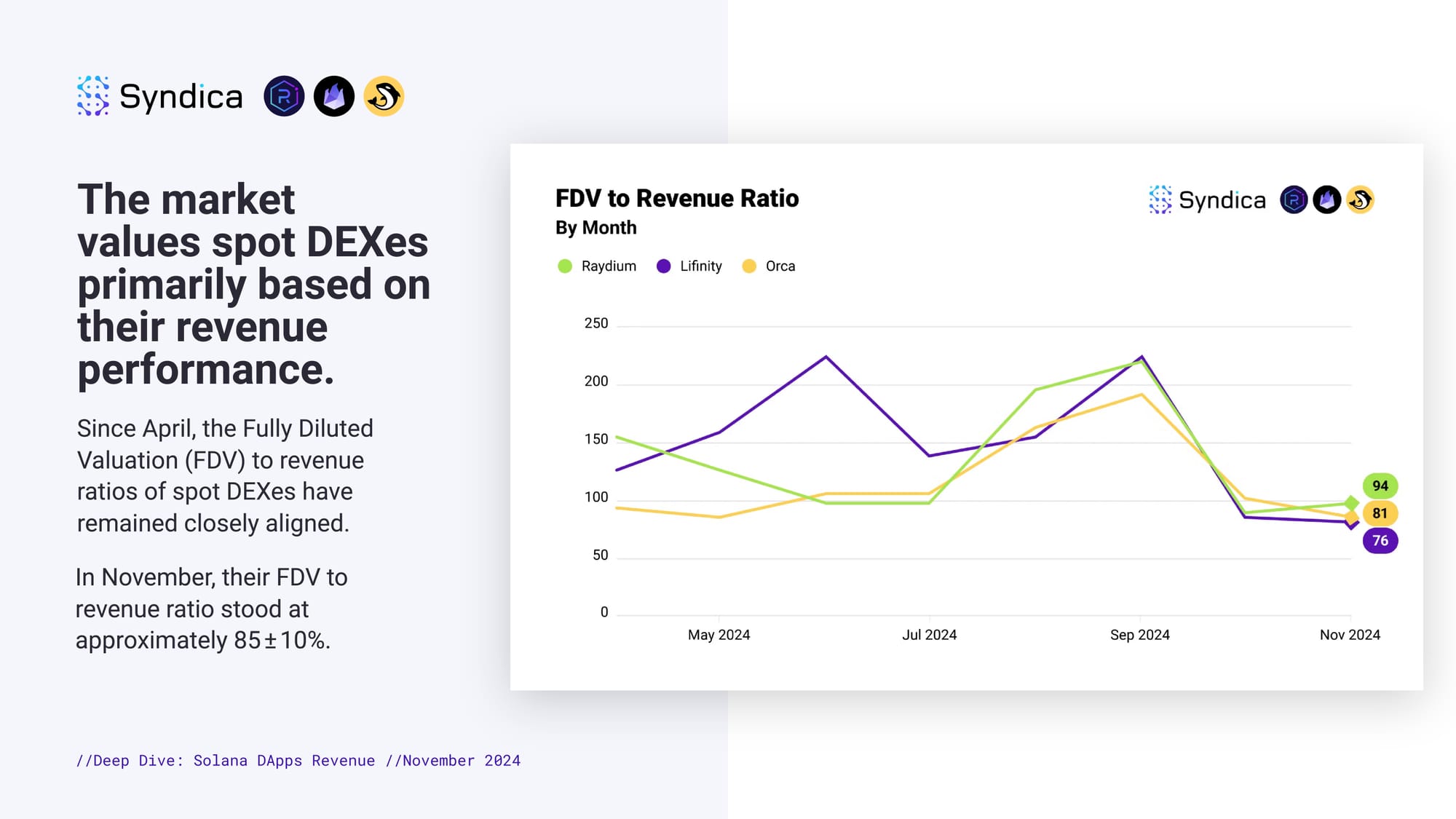 The market values spot DEXes primarily based on their revenue performance. Since April, the Fully Diluted Valuation (FDV) to revenue ratios of spot DEXes have remained closely aligned. In November, their FDV to revenue ratio stood at approximately 85 ± 10%.