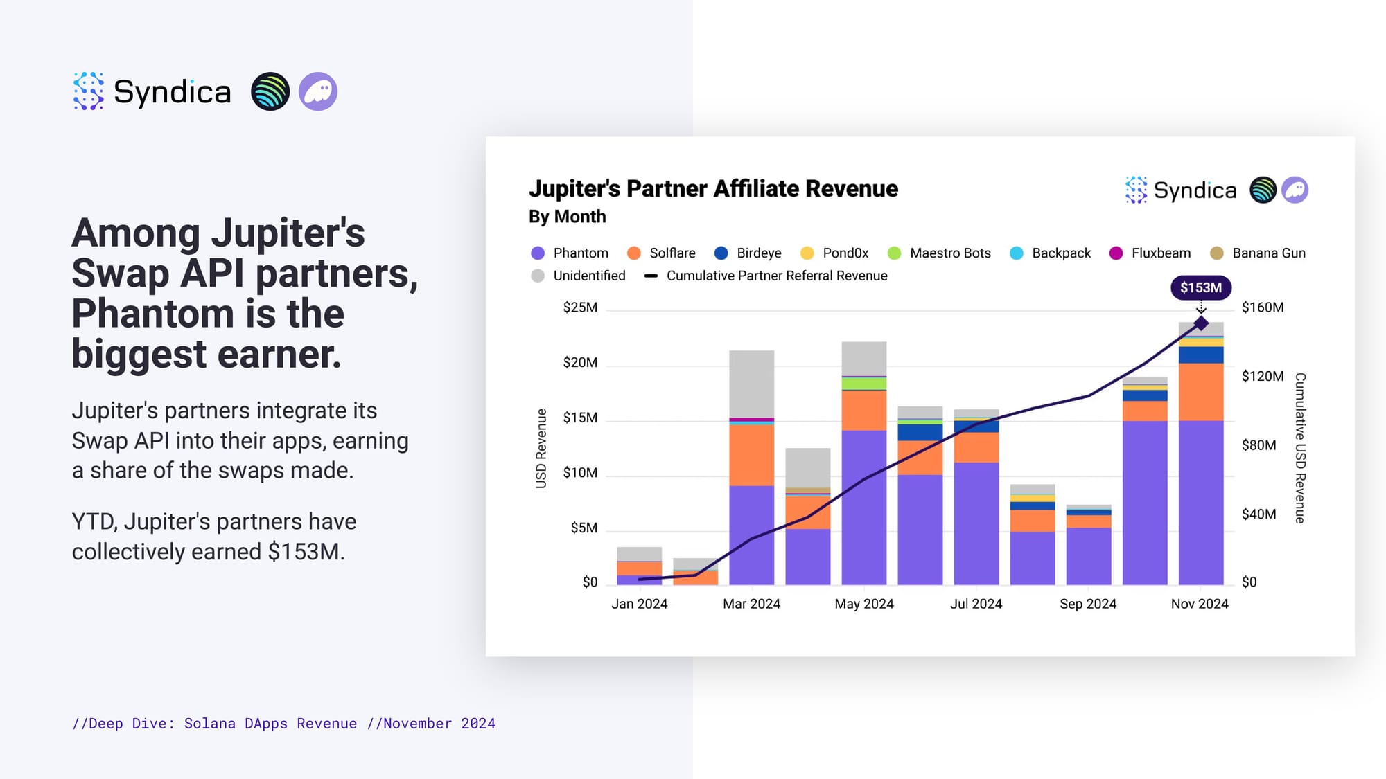 Among Jupiter's Swap API partners, Phantom is the biggest earner. Jupiter's partners integrate its Swap API into their apps, earning a share of the swaps made. YTD, Jupiter's partners have collectively earned $153M.