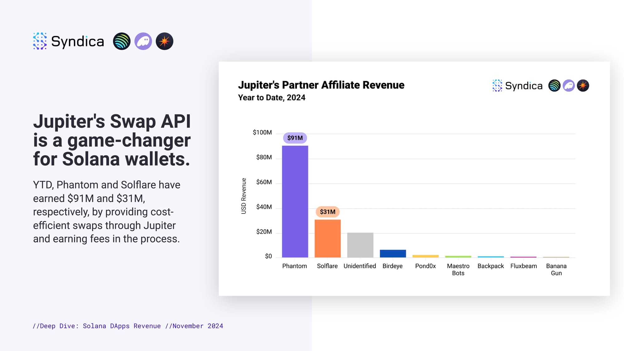 Jupiter's Swap API is a game-changer for Solana wallets. YTD, Phantom and Solflare have earned $91M and $31M, respectively, by providing cost-efficient swaps through Jupiter and earning fees in the process.