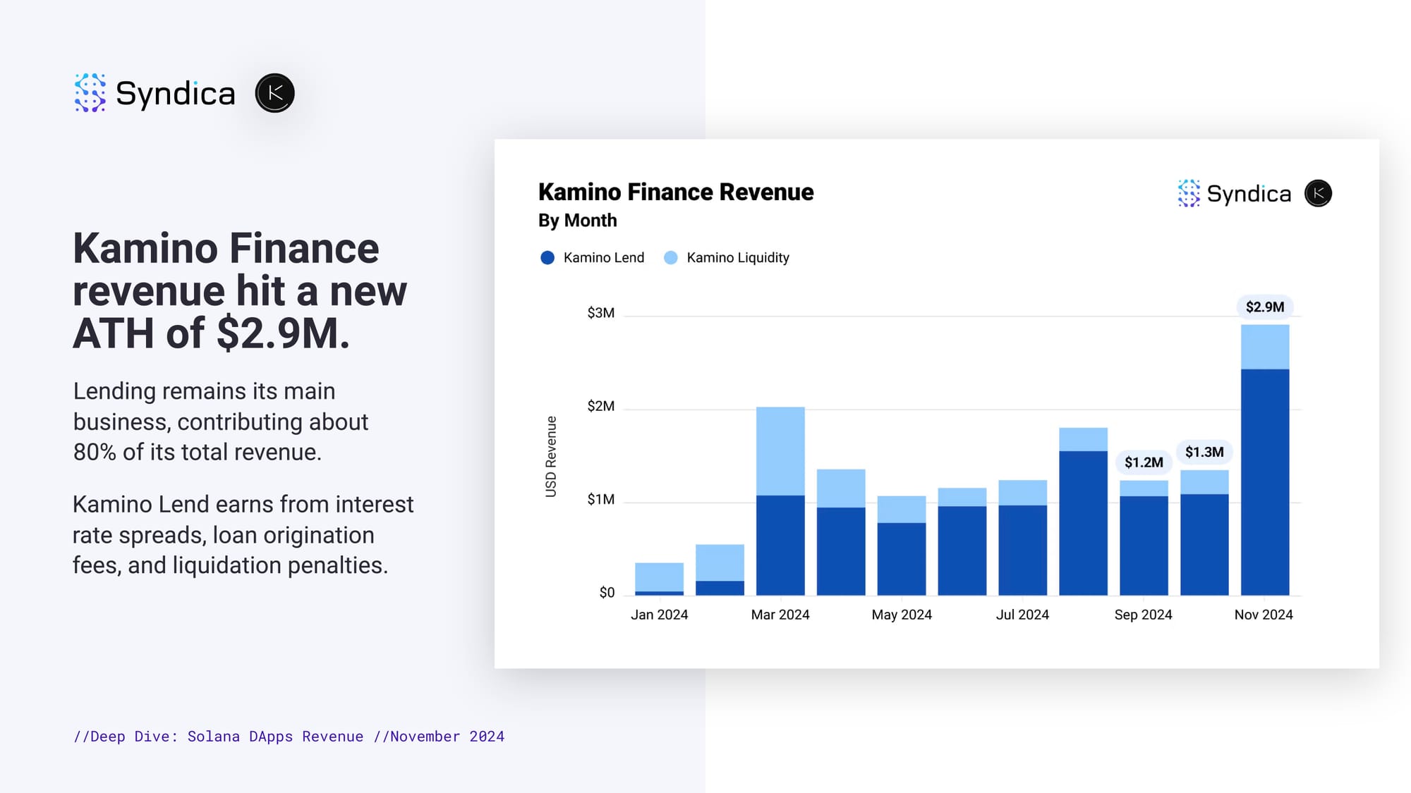 Kamino Finance revenue hit a new ATH of $2.9M. Lending remains its main business, contributing about 80% of its total revenue. Kamino Lend earns from interest rate spreads, loan origination fees, and liquidation penalties.