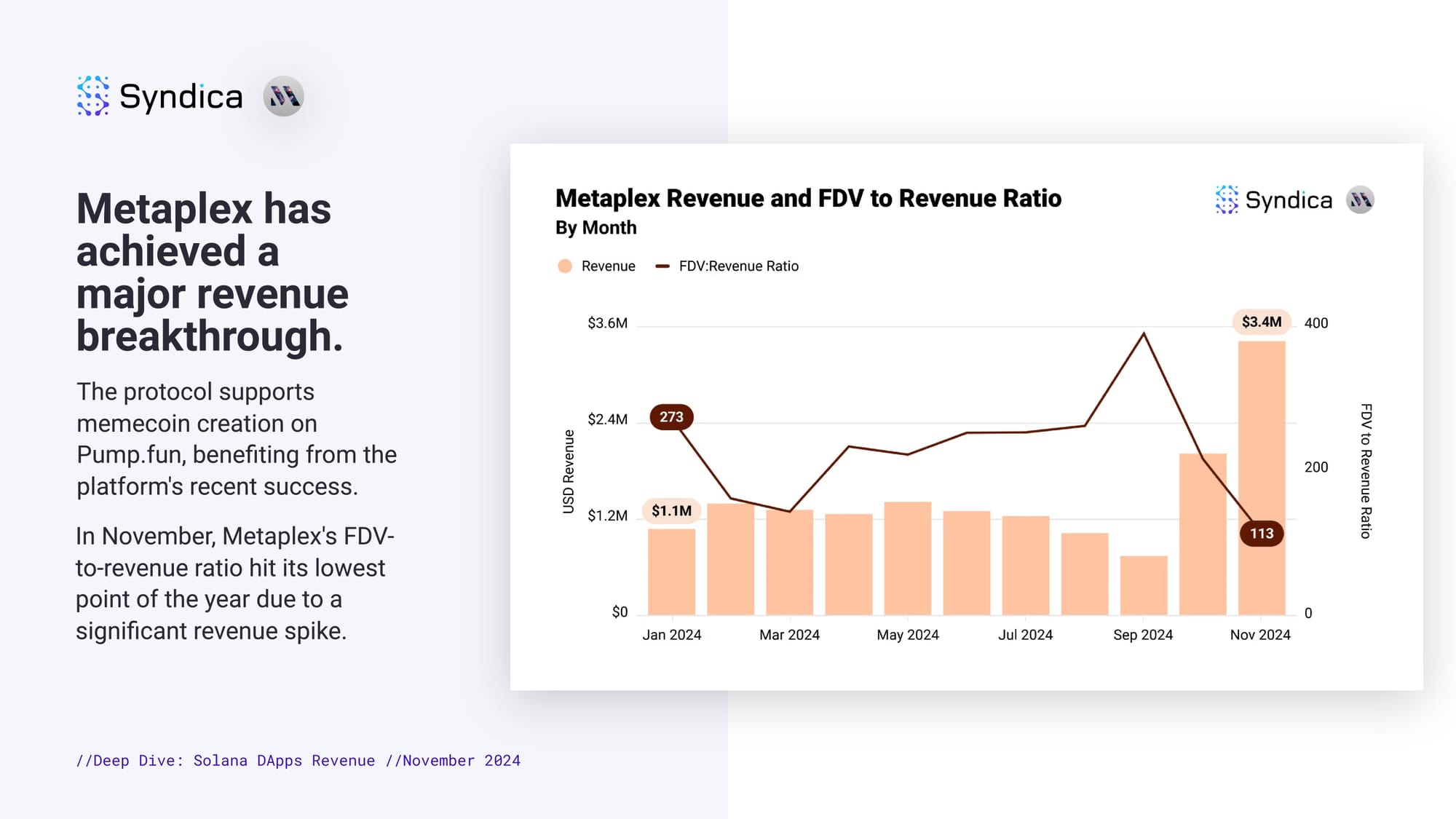 Metaplex has achieved a major revenue breakthrough. The protocol supports memecoin creation on Pump.fun, benefiting from the platform's recent success. In November, Metaplex's FDV-to-revenue ratio hit its lowest point of the year due to a significant revenue spike.
