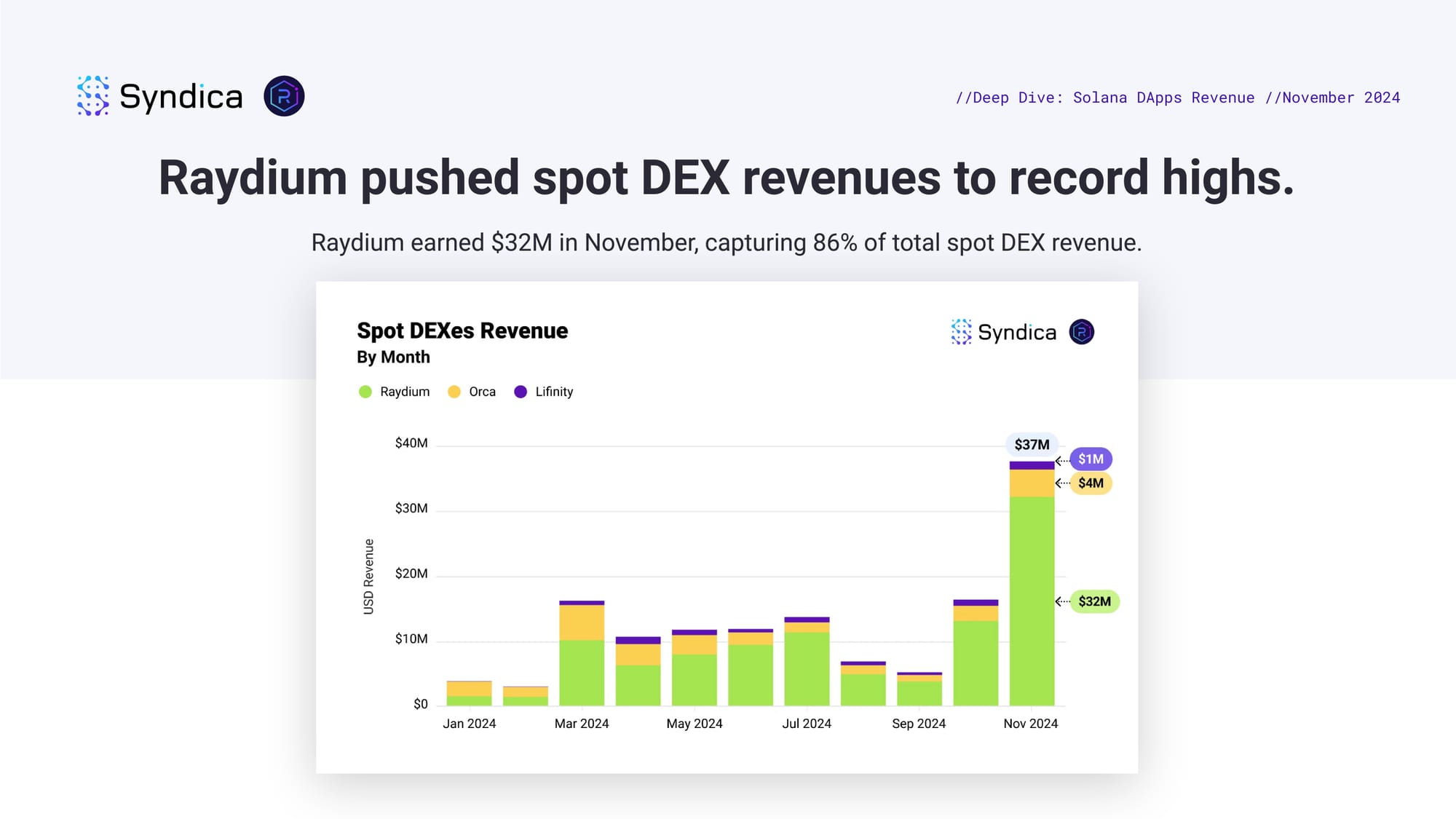 Raydium pushed spot DEX revenues to record highs. Raydium earned $32M in November, capturing 86% of total spot DEX revenue.