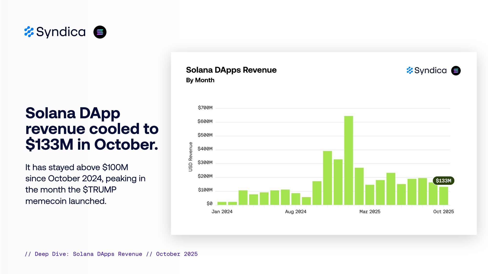 Solana DApp revenue cooled to $133M in October. It has stayed above $100M since October 2024, peaking in the month the $TRUMP memecoin launched.