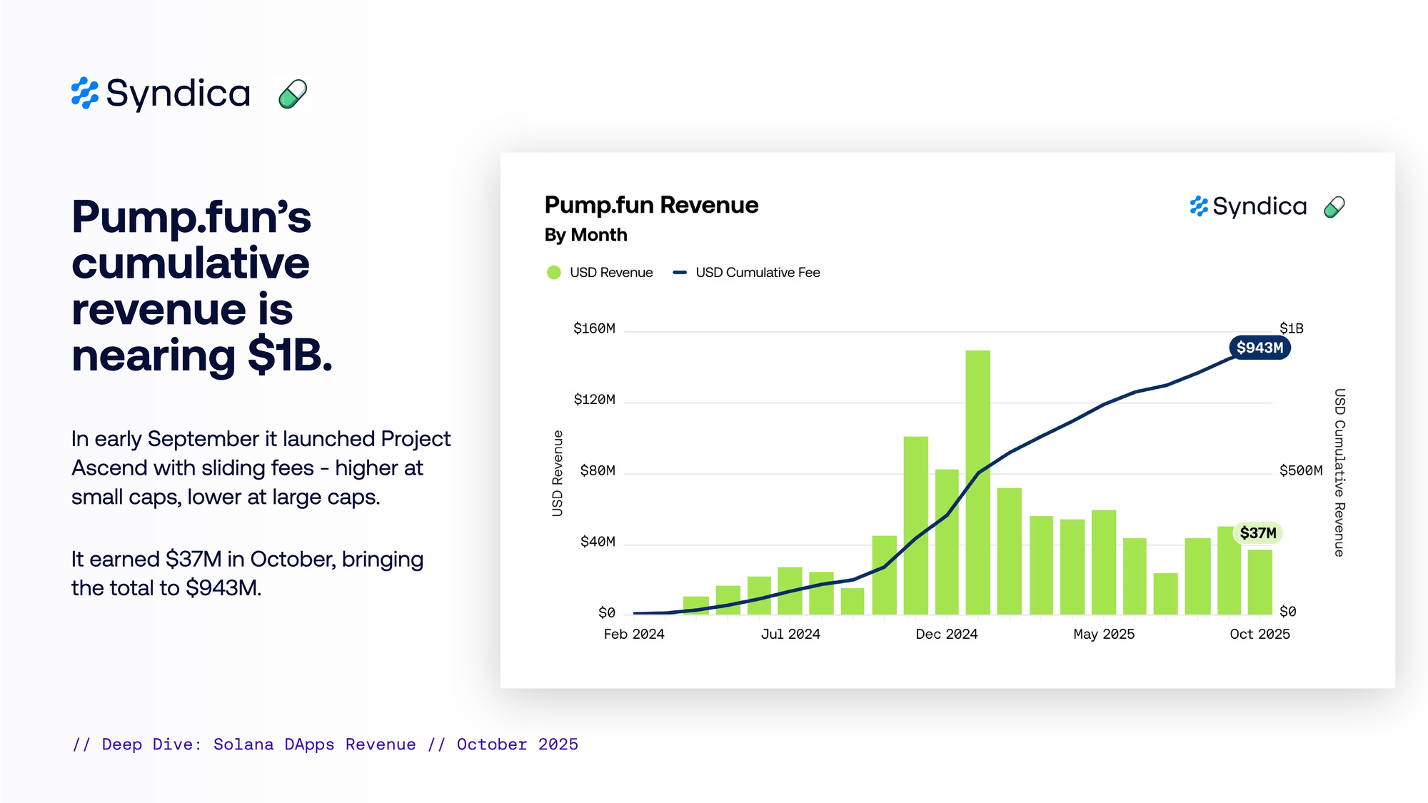 Pump.fun’s cumulative revenue is nearing $1B. In early September it launched Project Ascend with sliding fees - higher at small caps, lower at large caps. It earned $37M in October, bringing the total to $943M.