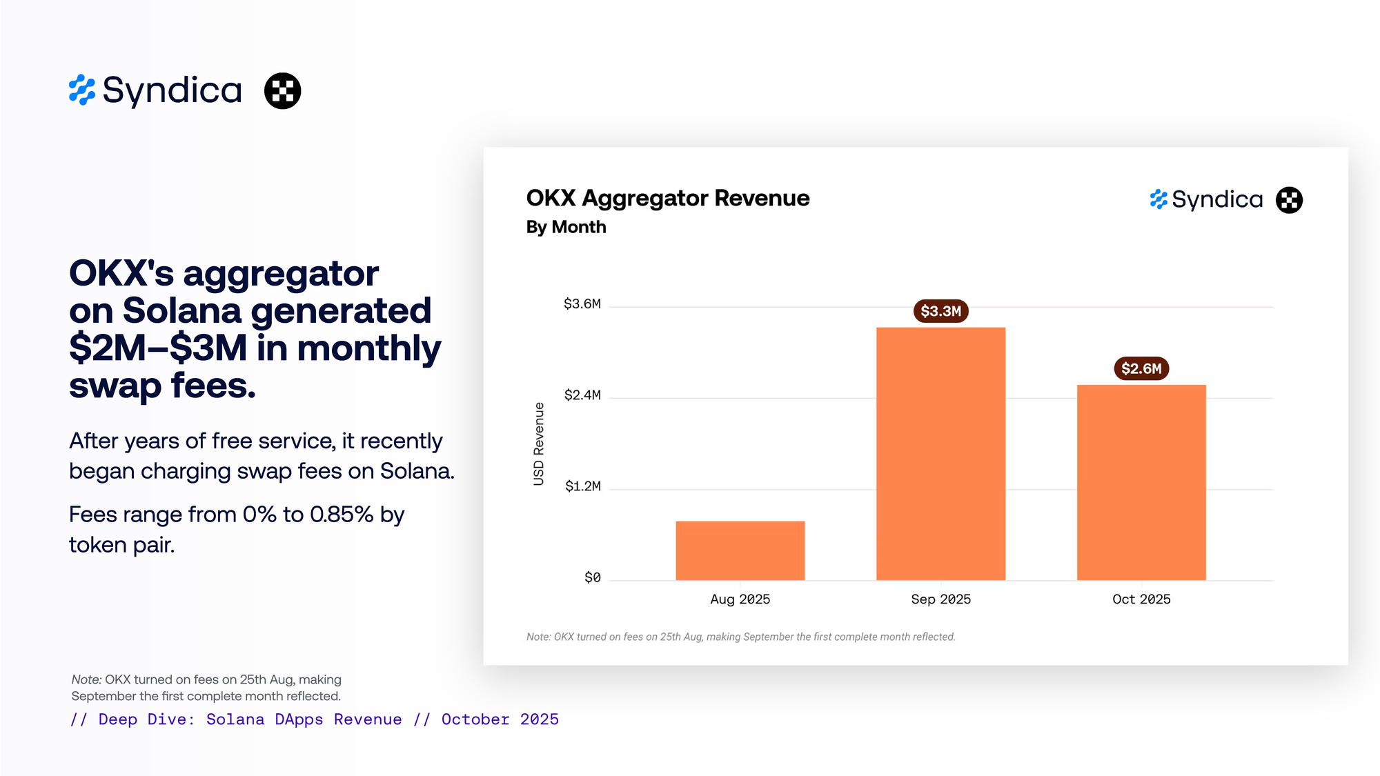 OKX's aggregator on Solana generated $2M–$3M in monthly swap fees. After years of free service, it recently began charging swap fees on Solana. Fees range from 0% to 0.85% by token pair.