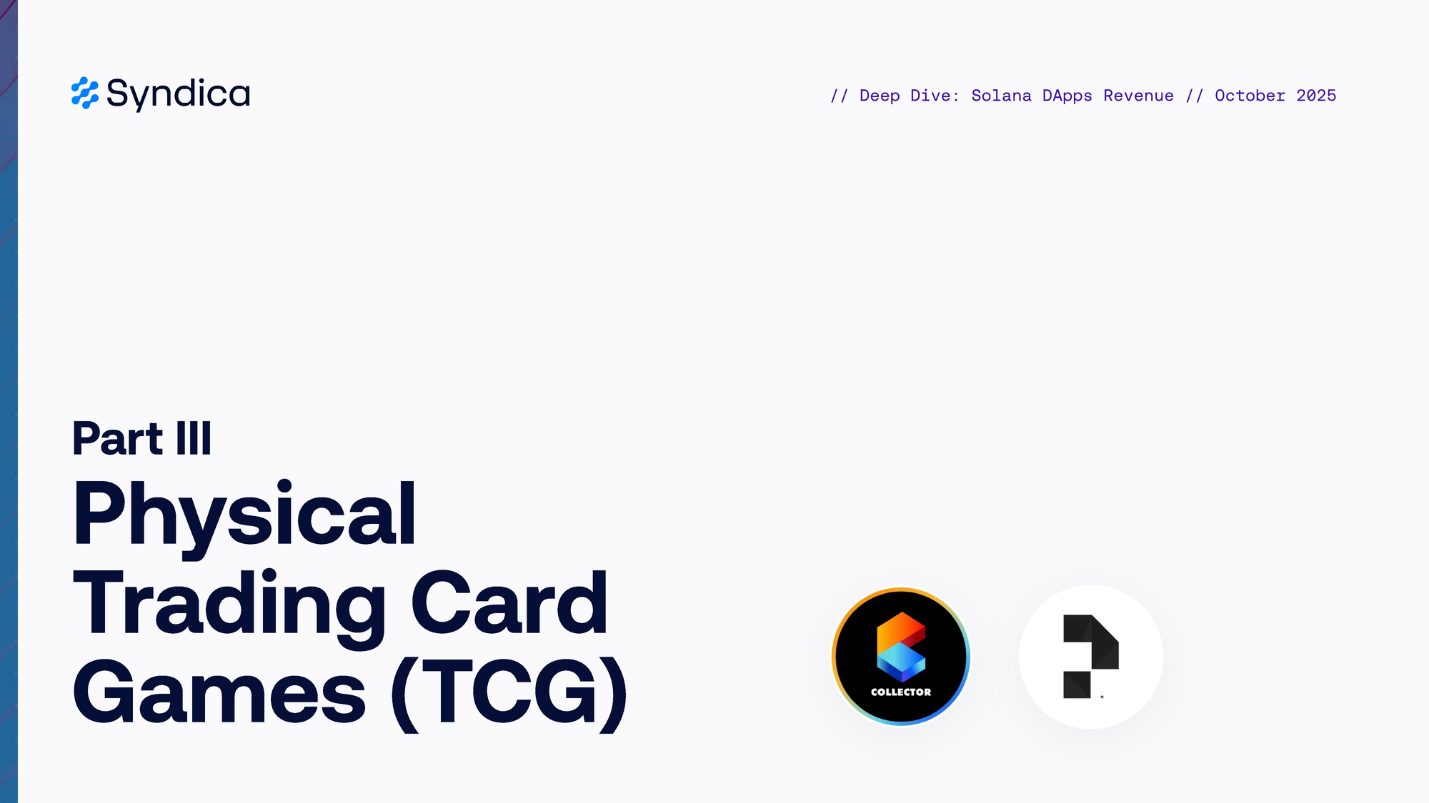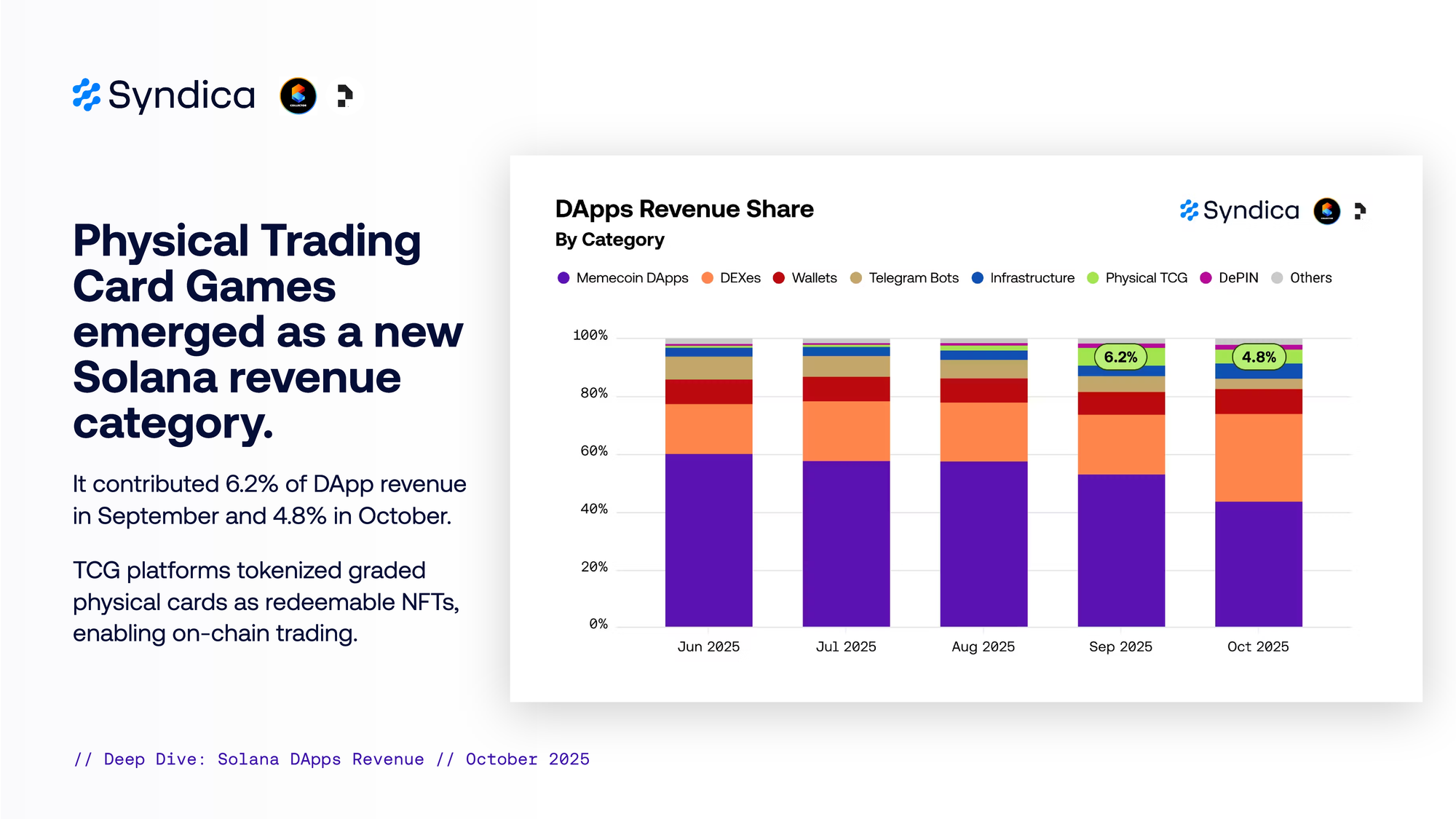 Physical Trading Card Games emerged as a new Solana revenue category. It contributed 6.2% of DApp revenue in September and 4.8% in October. TCG platforms tokenized graded physical cards as redeemable NFTs, enabling on-chain trading.