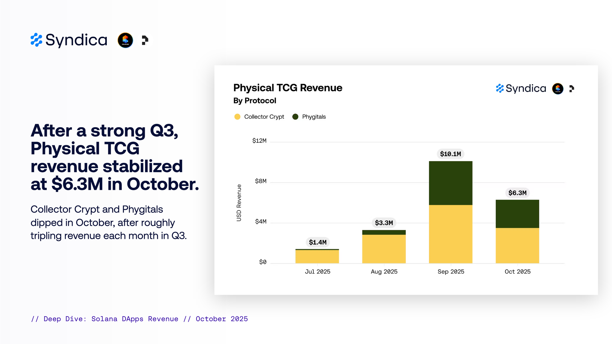 After a strong Q3, Physical TCG revenue stabilized at $6.3M in October. Collector Crypt and Phygitals dipped in October, after roughly tripling revenue each month in Q3.
