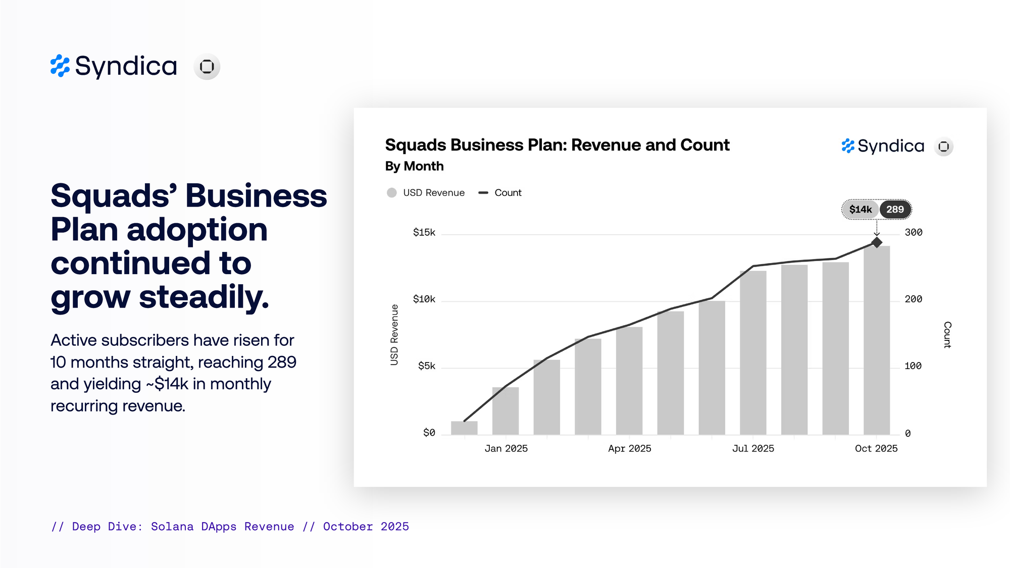 Squads’ Business Plan adoption continued to grow steadily. Active subscribers have risen for 10 months straight, reaching 289 and yielding ~$14k in monthly recurring revenue.