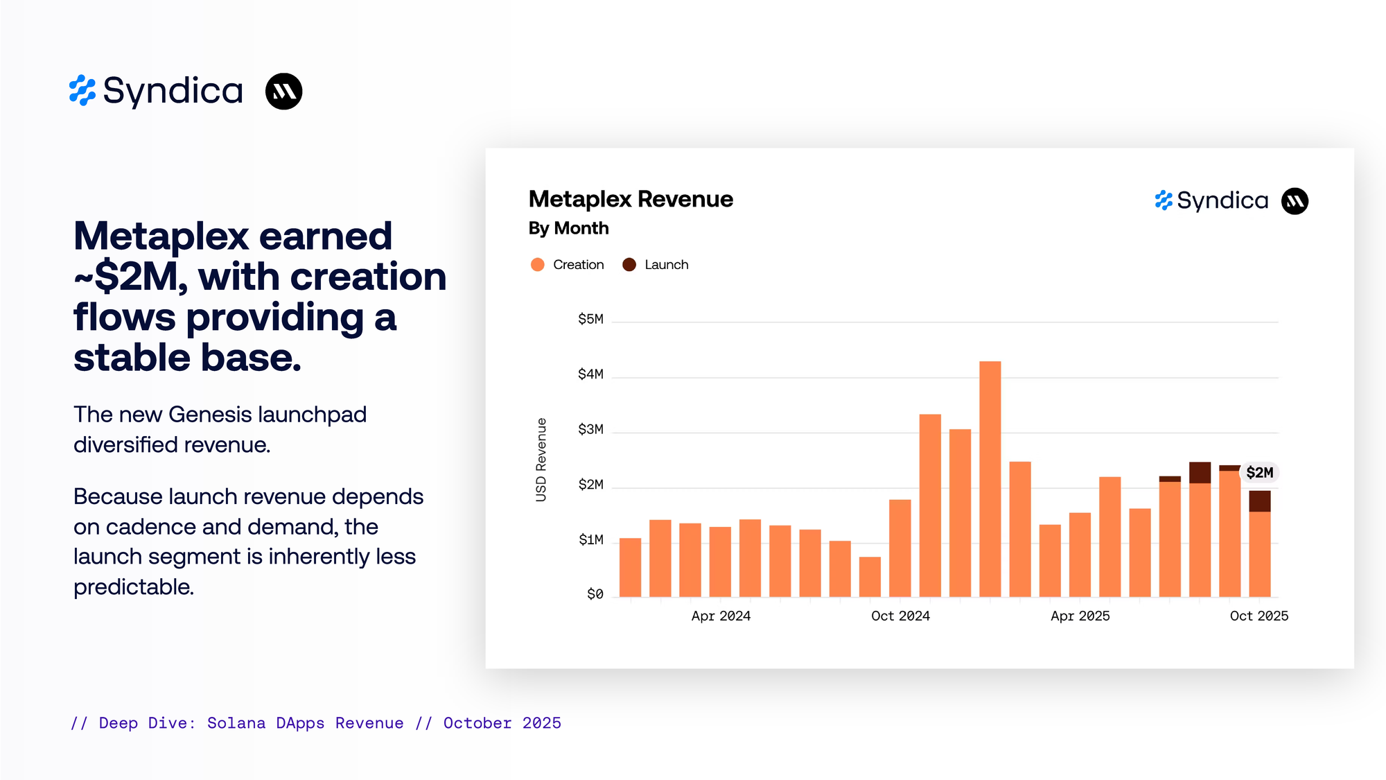 Metaplex earned ~$2M, with creation flows providing a stable base. The new Genesis launchpad diversified revenue. Because launch revenue depends on cadence and demand, the launch segment is inherently less predictable.