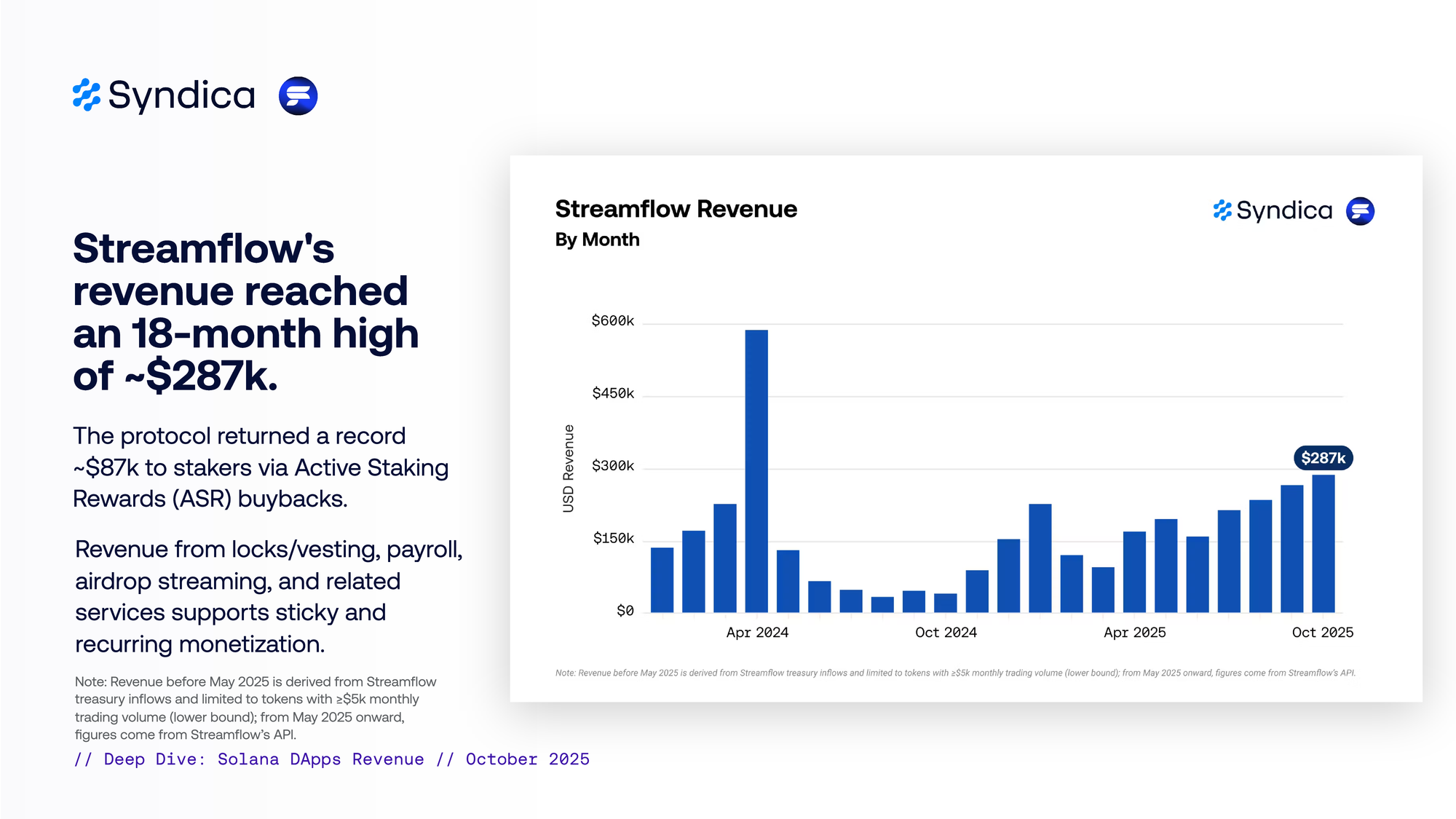 Streamflow's revenue reached an 18-month high of ~$287k. The protocol returned a record ~$87k to stakers via Active Staking Rewards (ASR) buybacks. Revenue from locks/vesting, payroll, airdrop streaming, and related services supports sticky and recurring monetization.