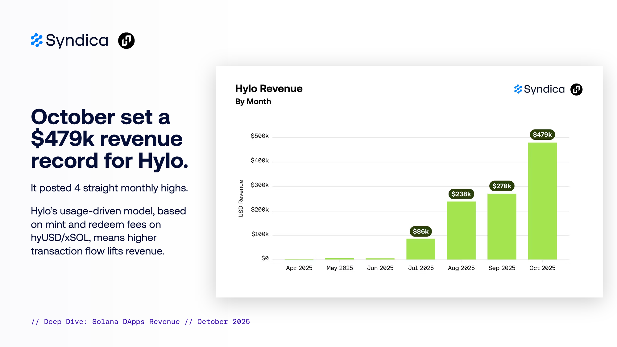October set a $479k revenue record for Hylo. It posted 4 straight monthly highs. Hylo’s usage-driven model, based on mint and redeem fees on hyUSD/xSOL, means higher transaction flow lifts revenue.