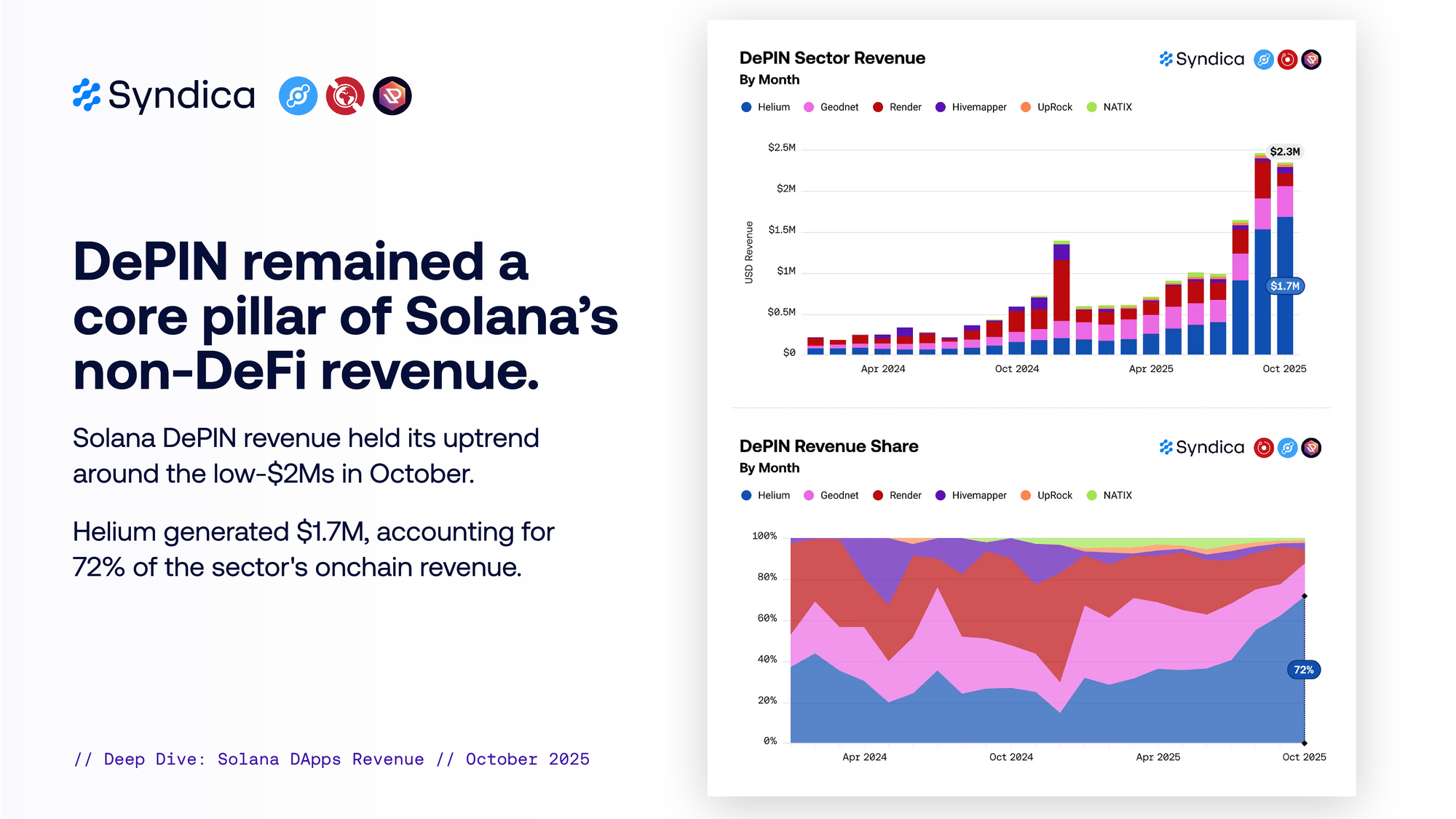 DePIN remained a core pillar of Solana’s non-DeFi revenue. Solana DePIN revenue held its uptrend around the low-$2Ms in October. Helium generated $1.7M, accounting for 72% of the sector's onchain revenue.