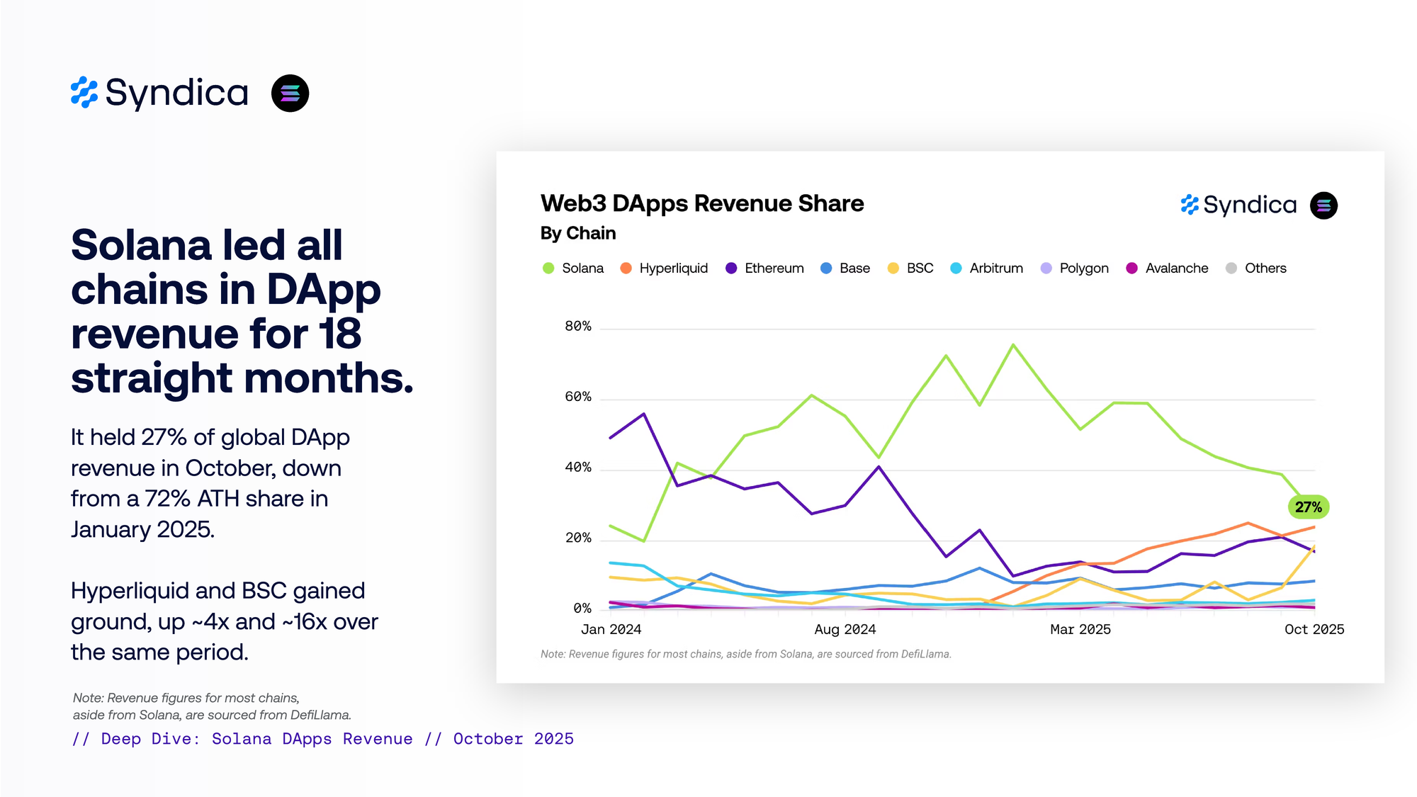Solana led all chains in DApp revenue for 18 straight months. It held 27% of global DApp revenue in October, down from a 72% ATH share in January 2025. Hyperliquid and BSC gained ground, up ~4x and ~16x over the same period.