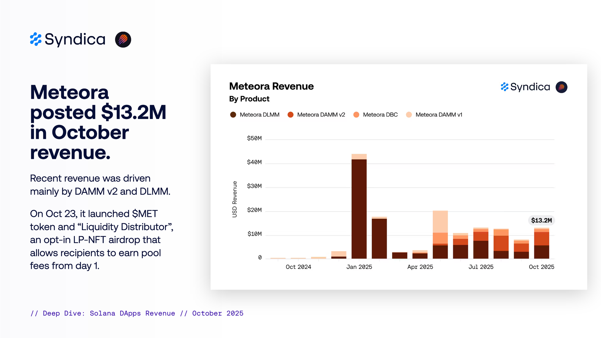 Meteora posted $13.2M in October revenue. Recent revenue was driven mainly by DAMM v2 and DLMM. On Oct 23, it launched $MET token and “Liquidity Distributor”, an opt-in LP-NFT airdrop that allows recipients to earn pool fees from day 1.
